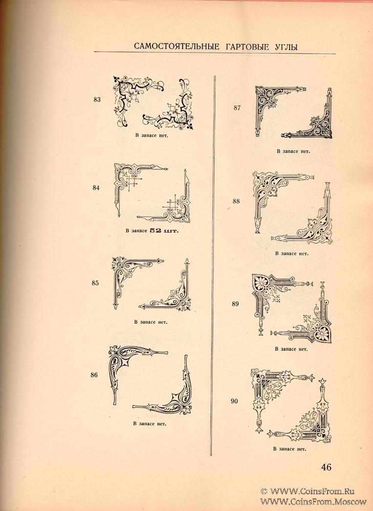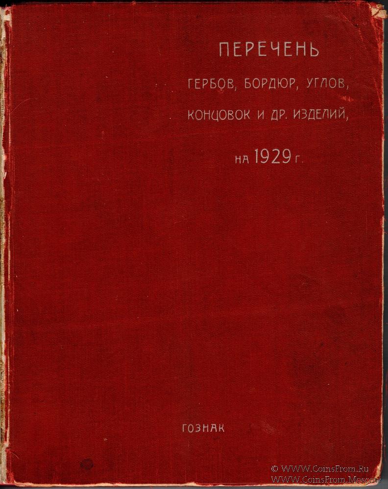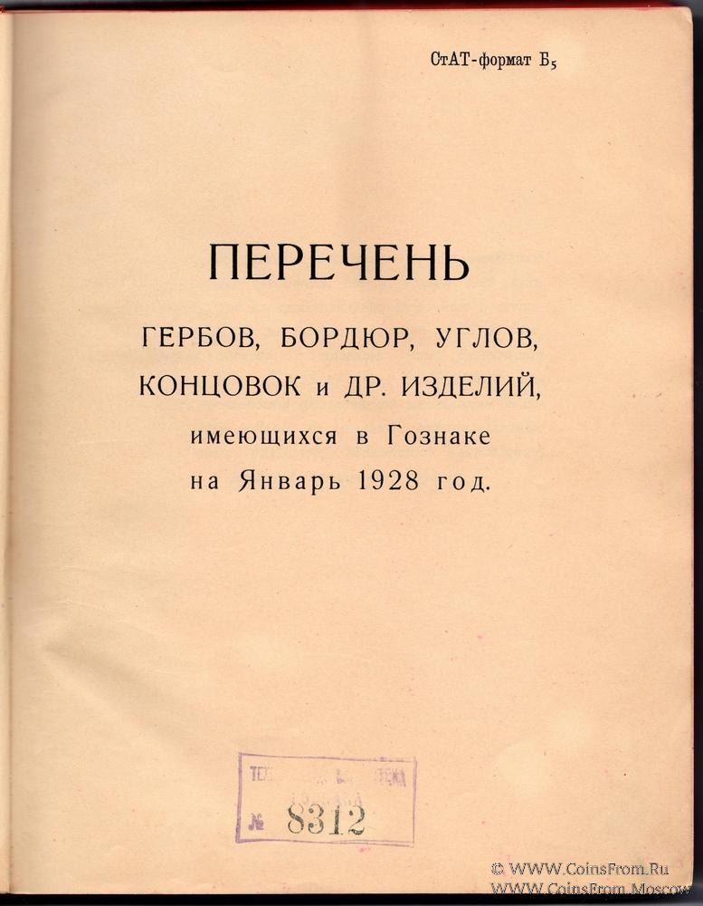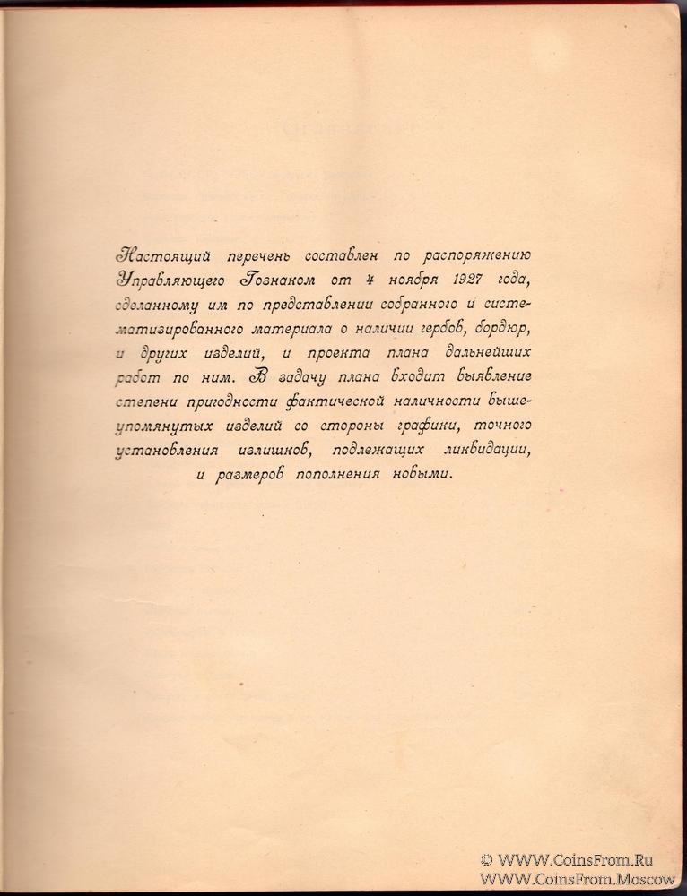 Перечень составлен по распоряжению Управляющего Гознаком от 4 ноября 1927 г. В издании приводятся иллюстрации всего перечня изделий, имеющихся в Гознаке на январь 1928 года. Рисунки высокого качества. В книге отсутствуют 2 листа. Издание на 237 страницах.