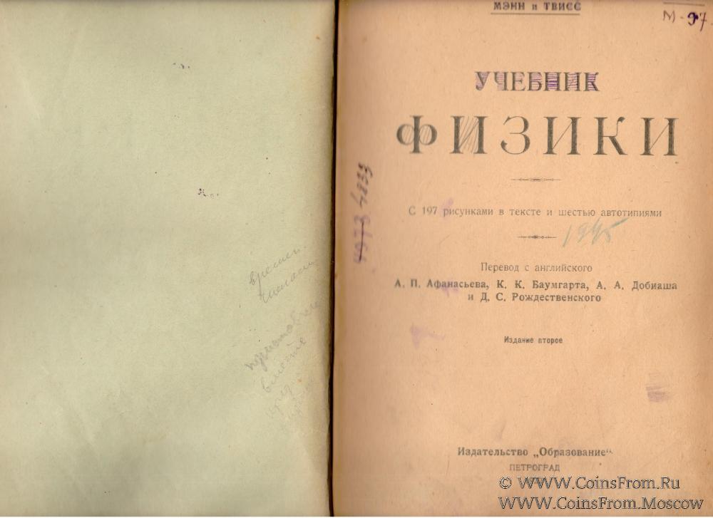 Учебник физики с 197 рисунками в тексте и шестью автотипиями. Перевод с английского А.П. Афанасьева, К.К. Баумгарта, А.А. Добиаша и Д.С. Рождественского. Издание второе. Издательство "Образование" Петроград. 1922г. 372 страницы.