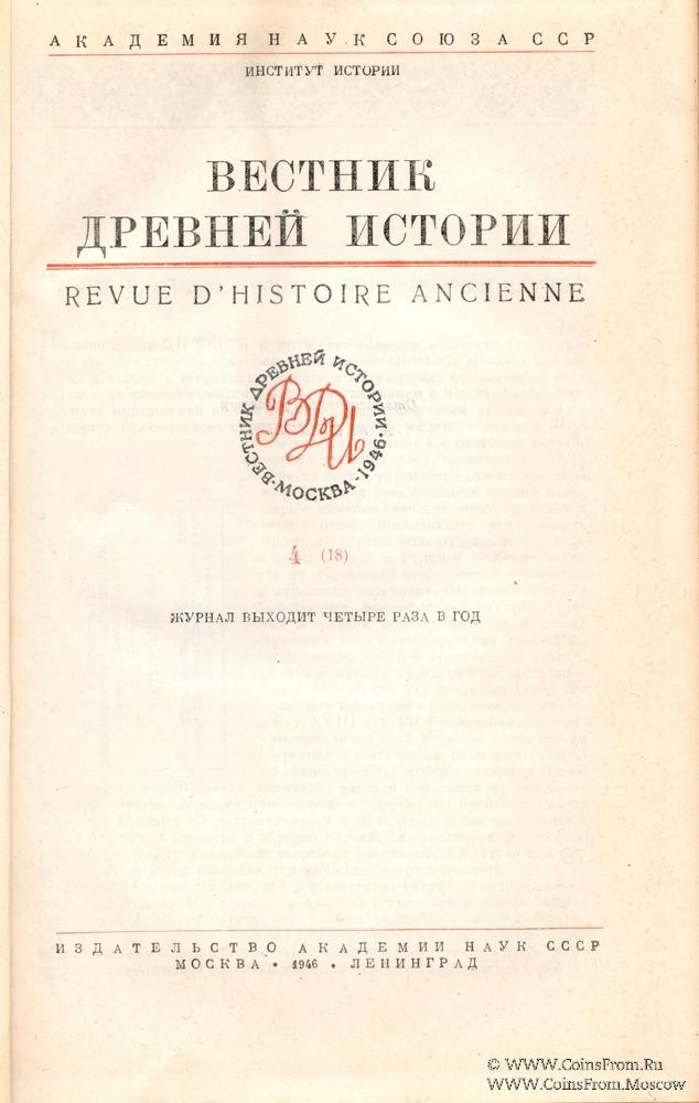 Институт Истории Академии наук СССР. Вестник древней истории № 4. Сборник статей. Издательство Академии Наук СССР. Москва. Ленинград. 1946 г. 329 страниц.