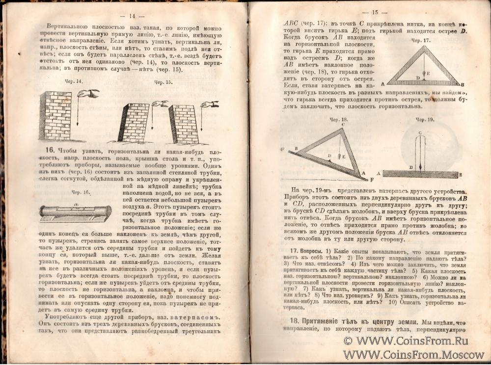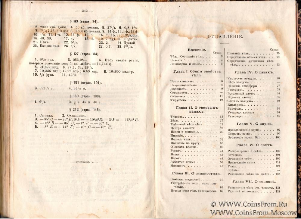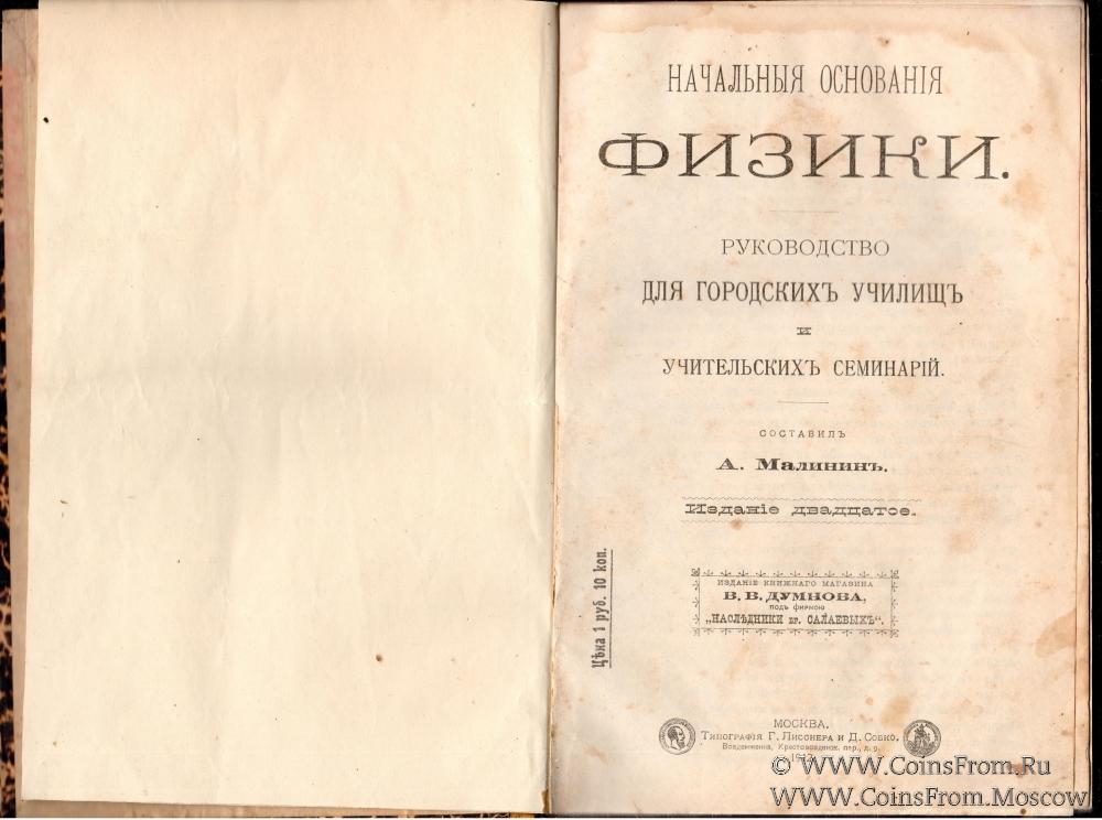 Начальные основания физики. Составил А. Малинин. Руководство для городских училищ и учительских семинарий. Издание двадцатое. Издание книжного магазина В.В. Думного под фирмой "Наследники бр. Салаевых". Типография Г. Лиссена и Д. Собко. Москва. Воздвиж. пер д.9 1912 г. 242 страницы.