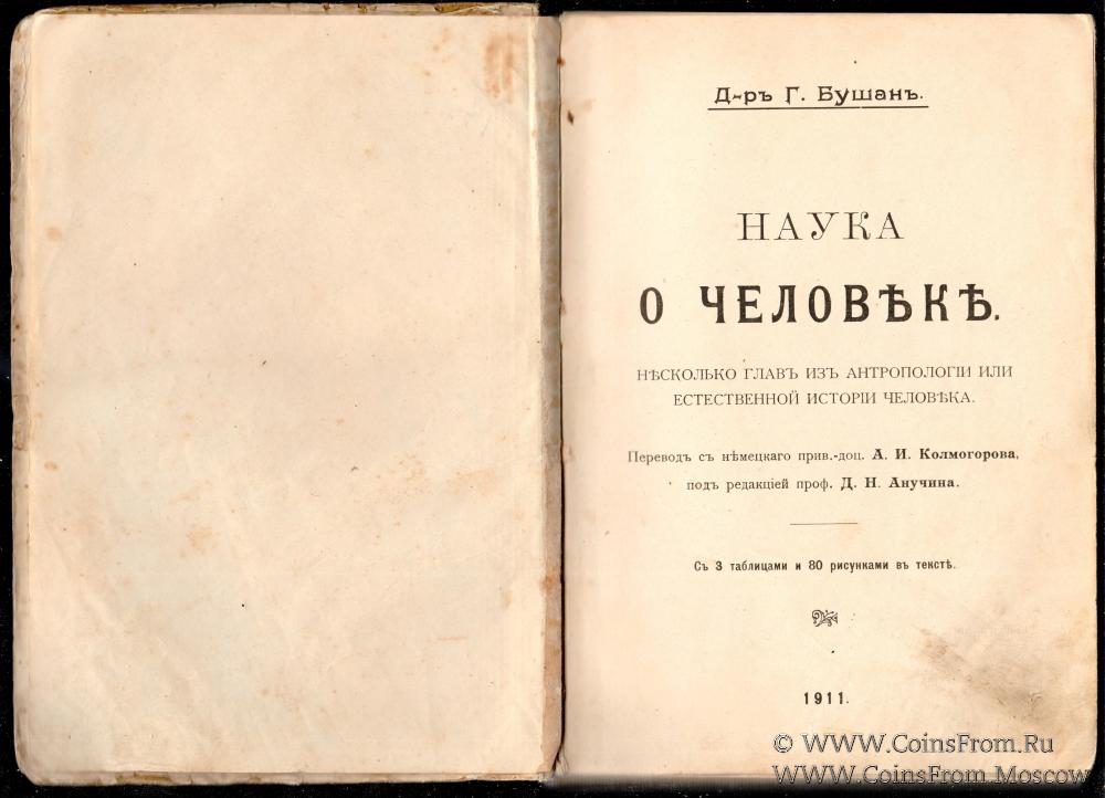 Д-р Г. Бушань. Наука о человеке. Несколько глав из антропологии или естественной истории человека. Перевод с немецкого прив.-доц.А.И. Колмогорова. Под редакцией проф. Д.Н. Анучина. С тремя таблицами и 80 рисунками в тексте. 1911 г. 341 страница.