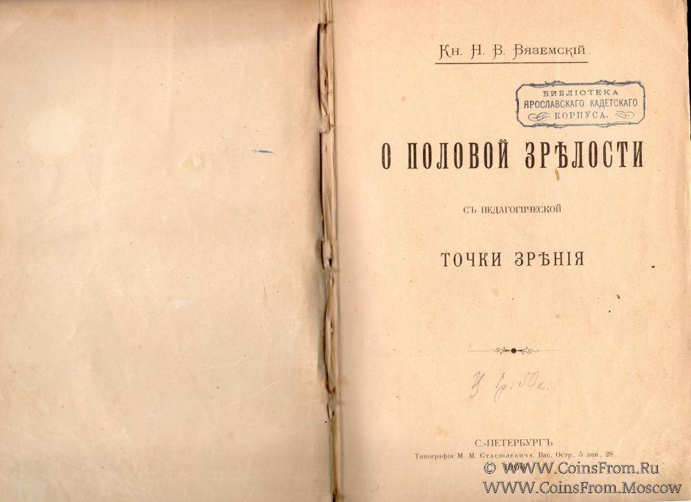 Кн. Н.В. Вяземский. О половой зрелости с педагогической точки зрения. С.-Петербург. Типография М.М. Стасюлевича. Вас. Остров 5 лин., 28. 1906 г. 246 страниц.