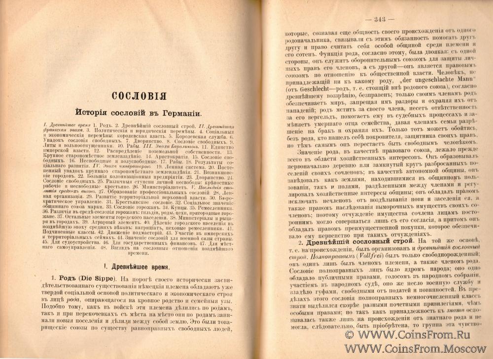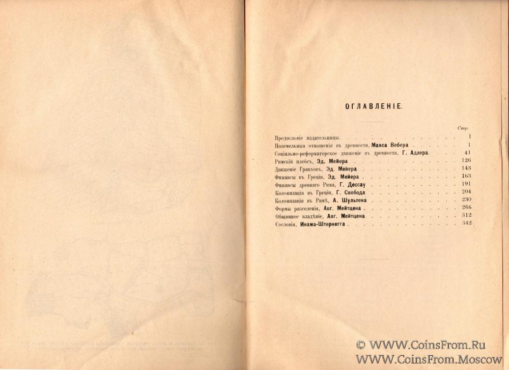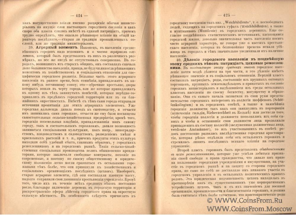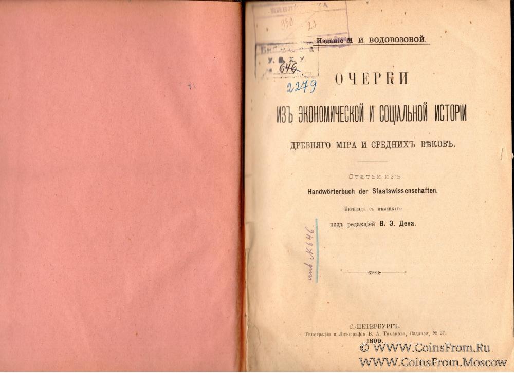 Издание И. Водовозовой. Очерки из экономической и социальной истории древнего мира и средних веков. Статьи из Handworterbuch der Staatswissenschaften. Перевод с немецкого по редакцией В.Э. Дена. С.-Петербург. Типография и литография В.А. Тиханова, Садовая, № 27. 1899 г. 442 страницы и приложения.