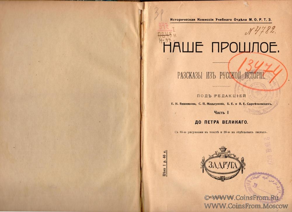 Историческая Коммиссия Учебного Отдела М.О.Р.Е.З. Наше прошлое. Рассказы из русской истории. Под редакцией Е.И. Вешнякова, С.П. Мельгунова, Б.Е. и В.Е. Сыроечковских. Часть 1. До Петра Великого. С 65 рисунками в тексте и 20 на отдельных листах. Москва. 1913 г. 367 страниц.