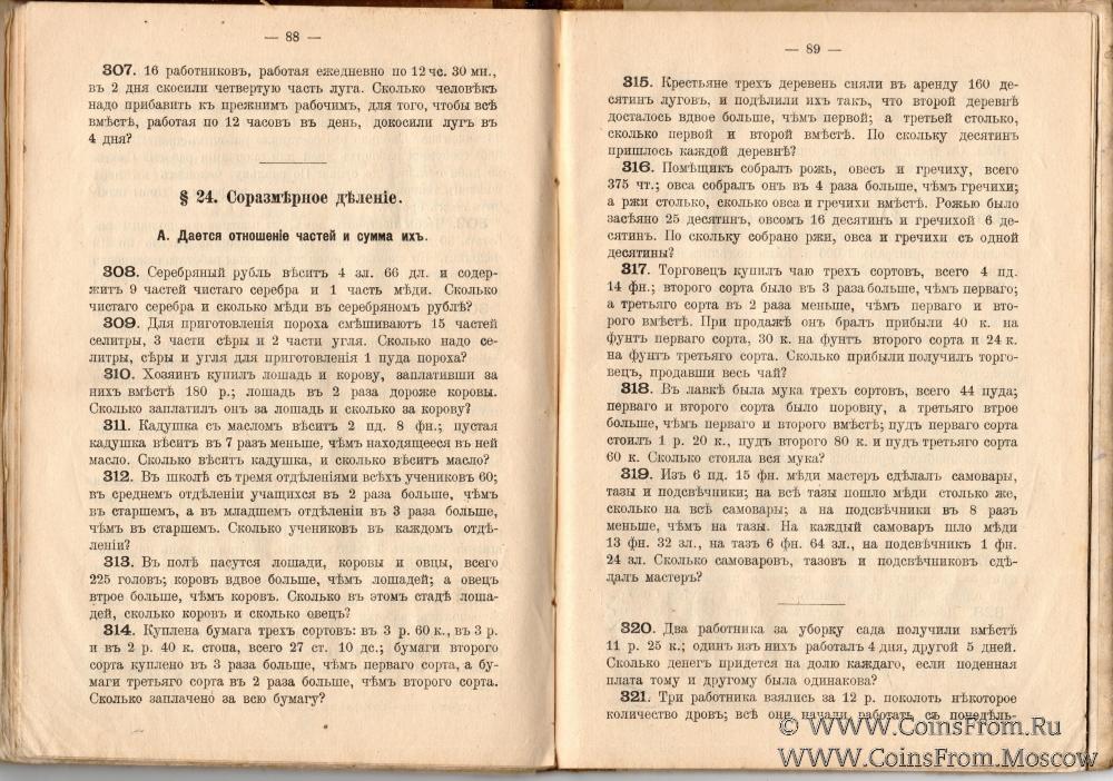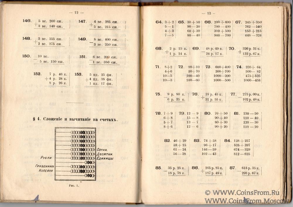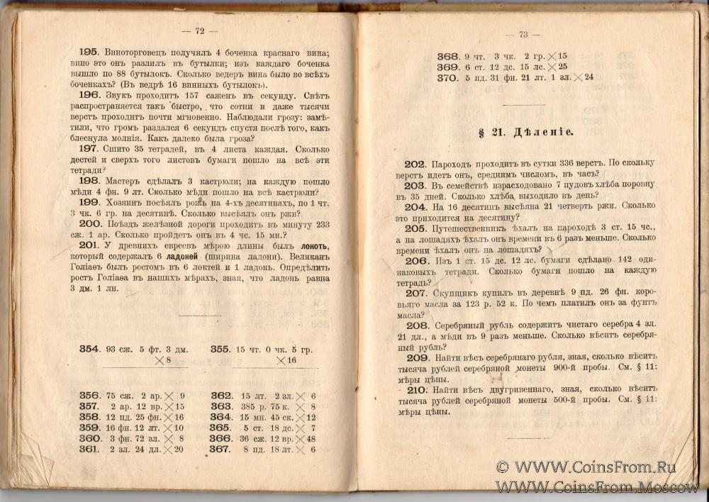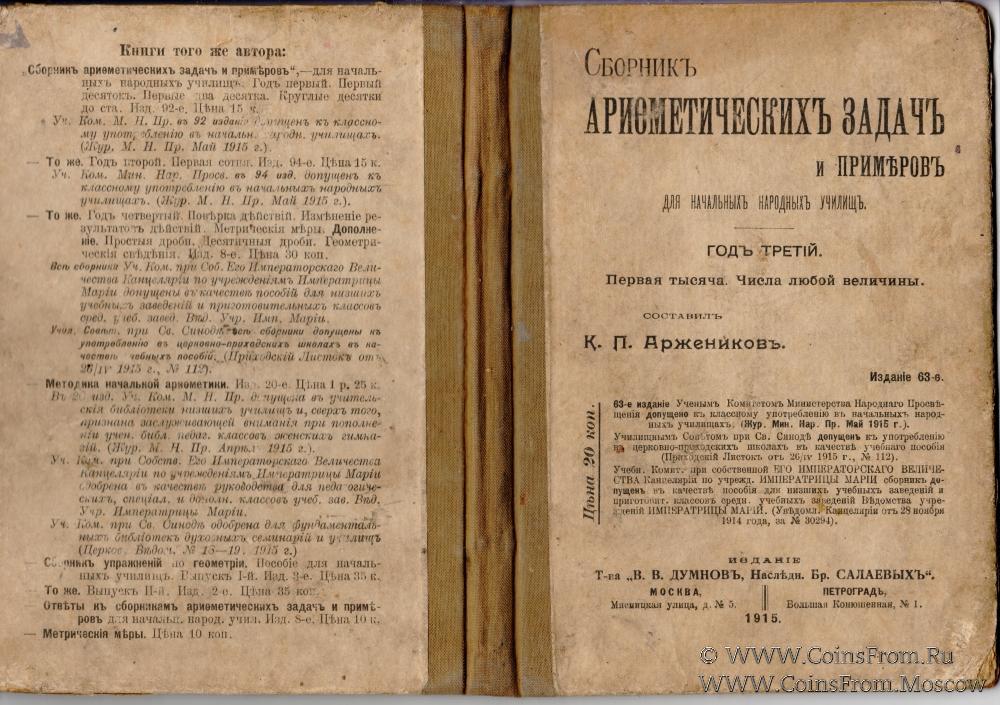 Сборник арифметических задач и примеров для начальных народных учи. Год третий. Составил К.П. Аржеников. Издание 63-е. Издание Товарищества "В.В. Думнов, Наследн. Бр. Салаевых". Москва, Мясницкая улица, д. № 5, Петроград, Вольная Конюшенная, № 1.1915 г.