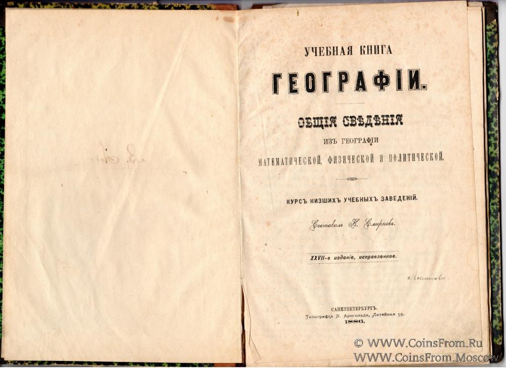 К. Смирнов. Учебная книга географии. Общие сведения из географии математической, физической и политической. Издание XVII, исправленное. Курс низших учебных заведений. СанктПетербург. Типография Э. Арнгольда, Литейная, 59, 1886 г. 75 страниц.
