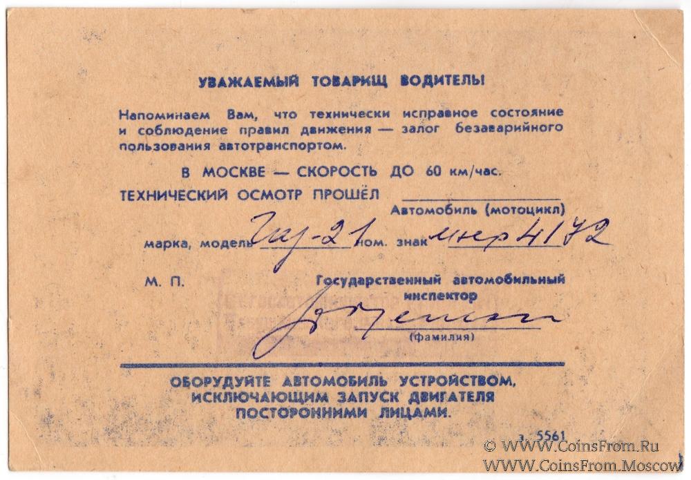 Талон технического осмотра 1982 г. Москва.