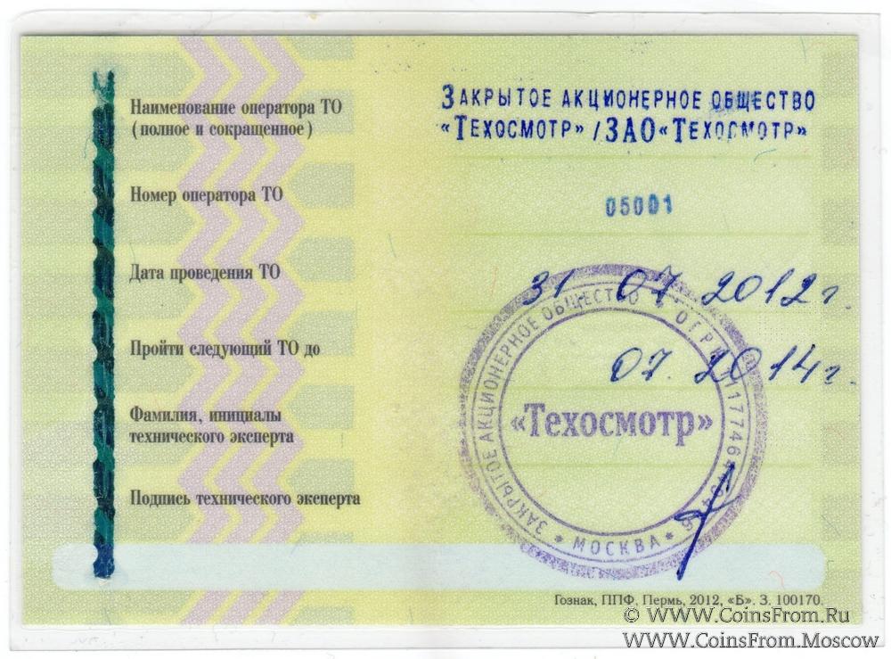 Талон технического осмотра 2012-14г. Москва.