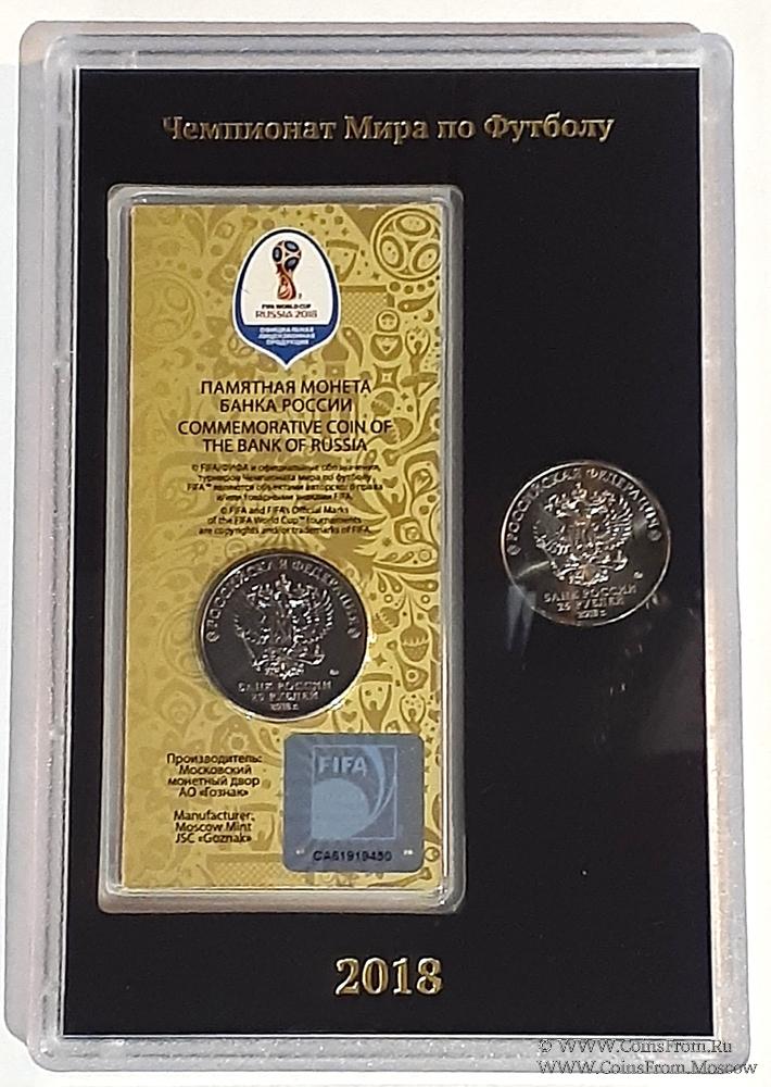 25 рублей 2018 г. (выпуск 2016 г.) - памятная монета из медно-никелевого сплава с выполненным на реверсе в цвете изображением Кубка Чемпионата мира по футболу FIFA, справа – надпись в пять строк: "ЧЕМПИОНАТ МИРА ПО ФУТБОЛУ FIFA 2018 В РОССИИ".