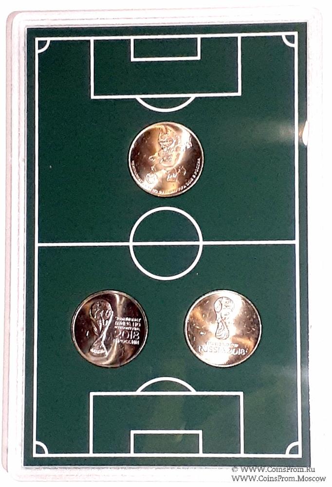 Набор, посвященный Чемпионату Мира по футболу в 2018 году в России, в пластиковом буклете с зелёной подложкой с футбольной разметкой (вариант 6). Московский монетный двор (ММД).