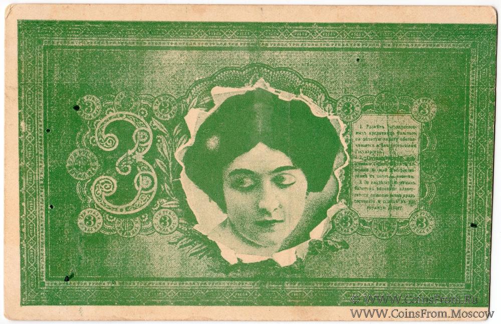 Открытка стилизована под 3 рубля 1905 г., с изображением девушки по центру (Лина Кавальери. Париж). Вариант 1: зеленый цвет.
