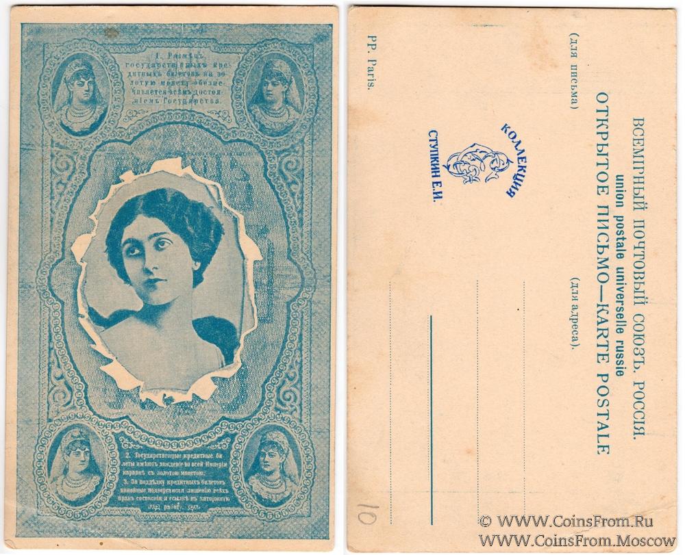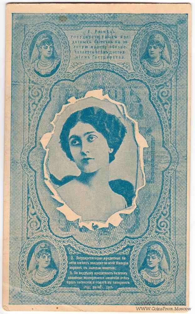 Открытка стилизована под 5 рублей 1898 г., с изображением девушки по центру (Лина Кавальери. Париж). Вариант 2: синий портрет.