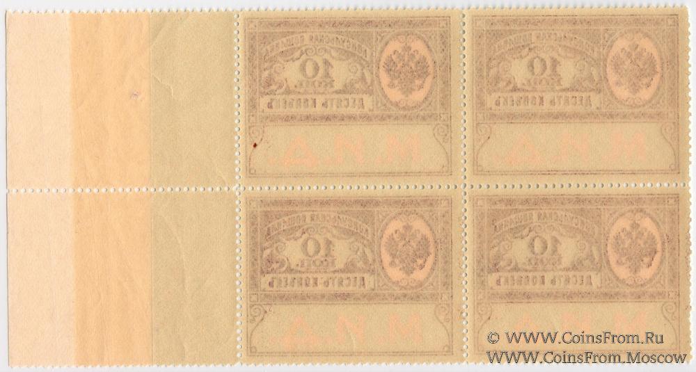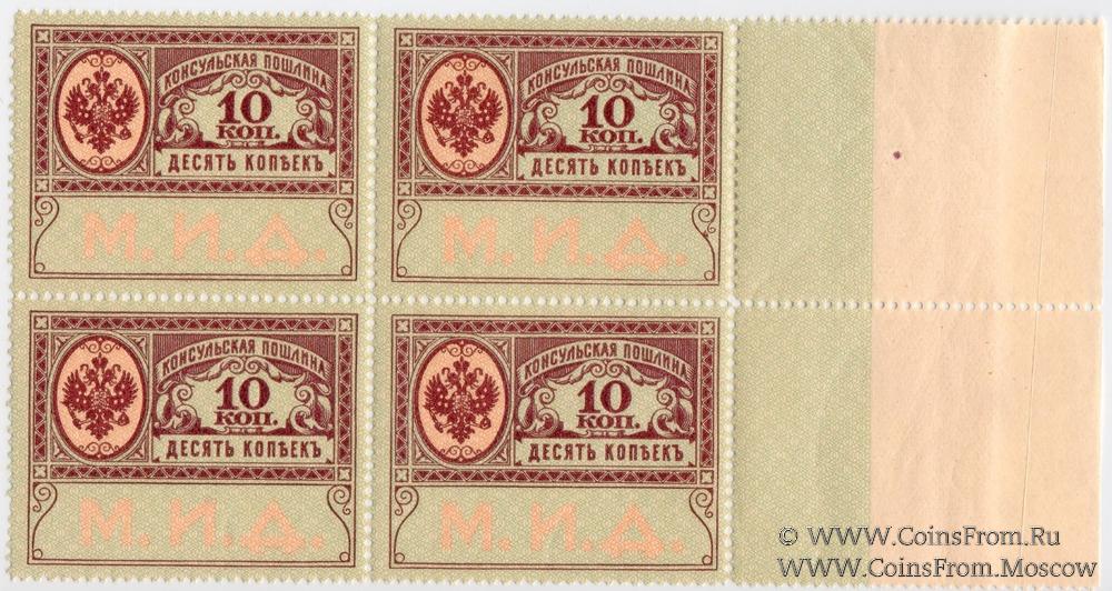 Марка консульской пошлины без даты (1913 г.). "М.И.Д.". Квартблок. Чистая с клеем без наклеек.
