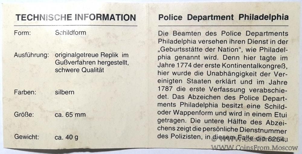 Жетон полиции. Штат Филадельфия. США. Коллекционная сертифицированная копия.