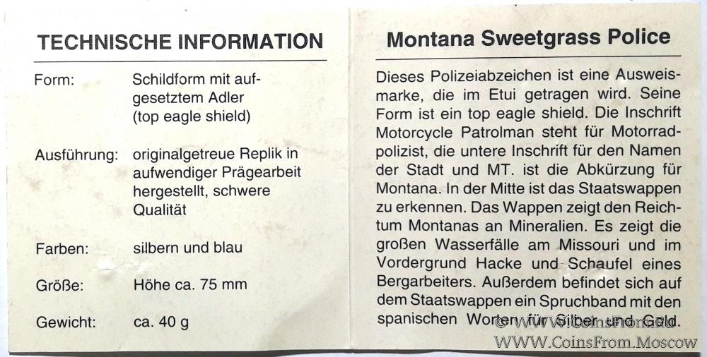 Жетон полиции. Мотопатруль. Штат Монтана США. Коллекционная сертифицированная копия.