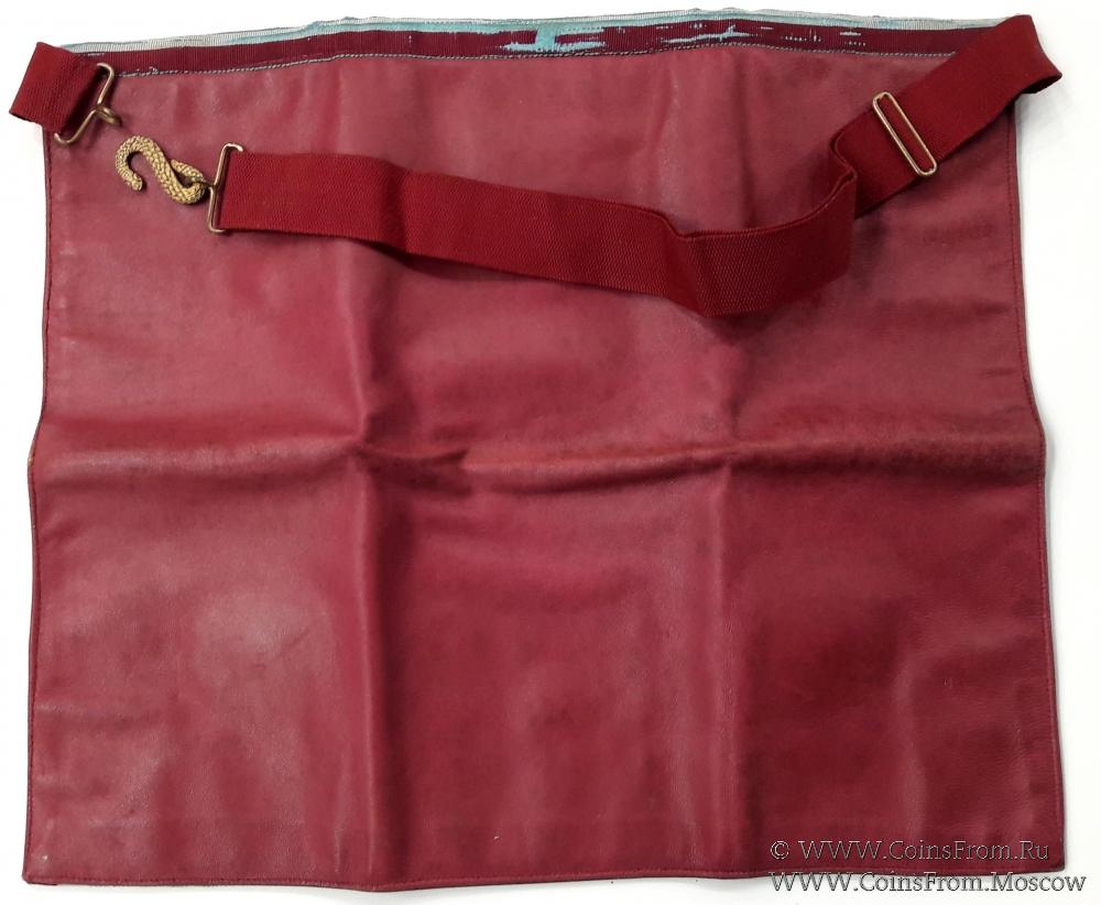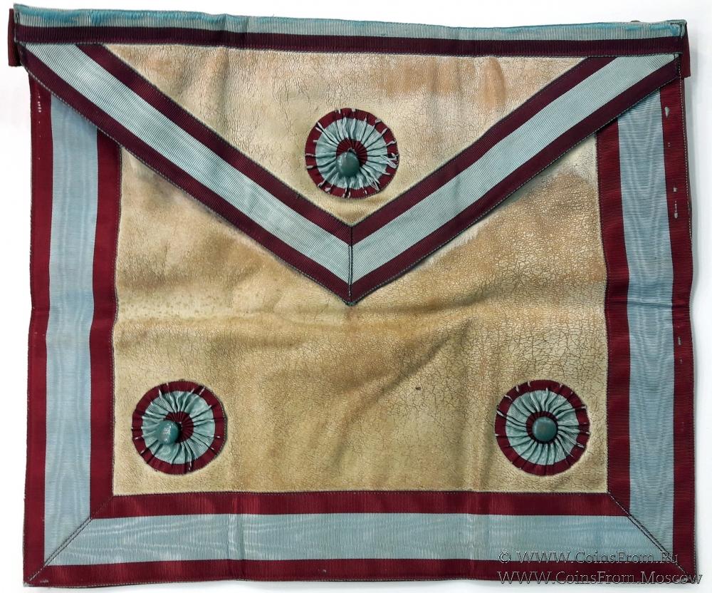 Запон из натуральной белой овчины-мерлушки. Запон белого цвета с треугольным клапаном ограничен по краю двухдюймовой лентой светло-синего цвета с малиновыми краями 50 мм шириной. На запоне расположены 3 розетки аналогичной окраски, которые у прошлого Мастера заменяются серебряными уровнями.