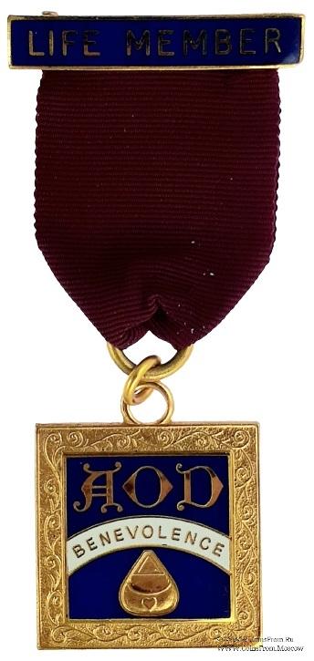 КОЛОДКИ/МЕДАЛЬОН: верхняя колодка прямоугольной формы синей эмали с надписью LIFE MEMBER (пожизненный член) с булавкой для ношения. Низ ленты без колодки продет в кольцо знака.