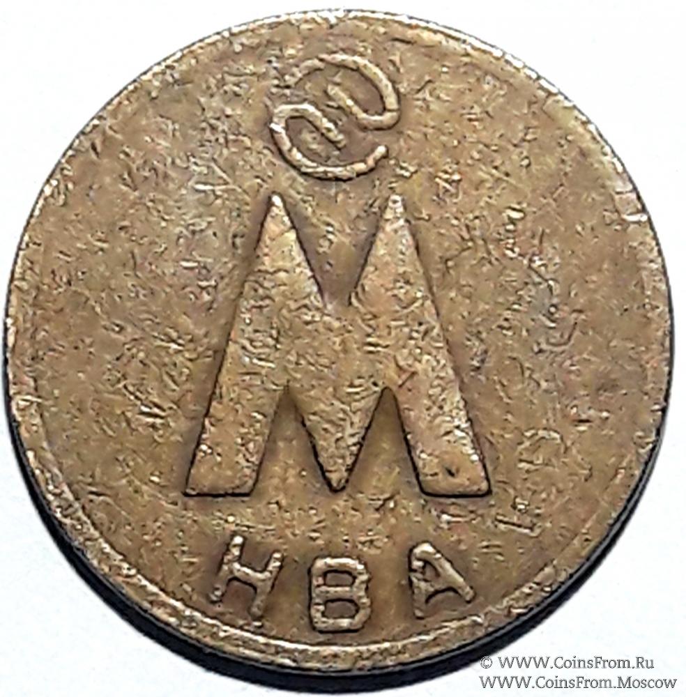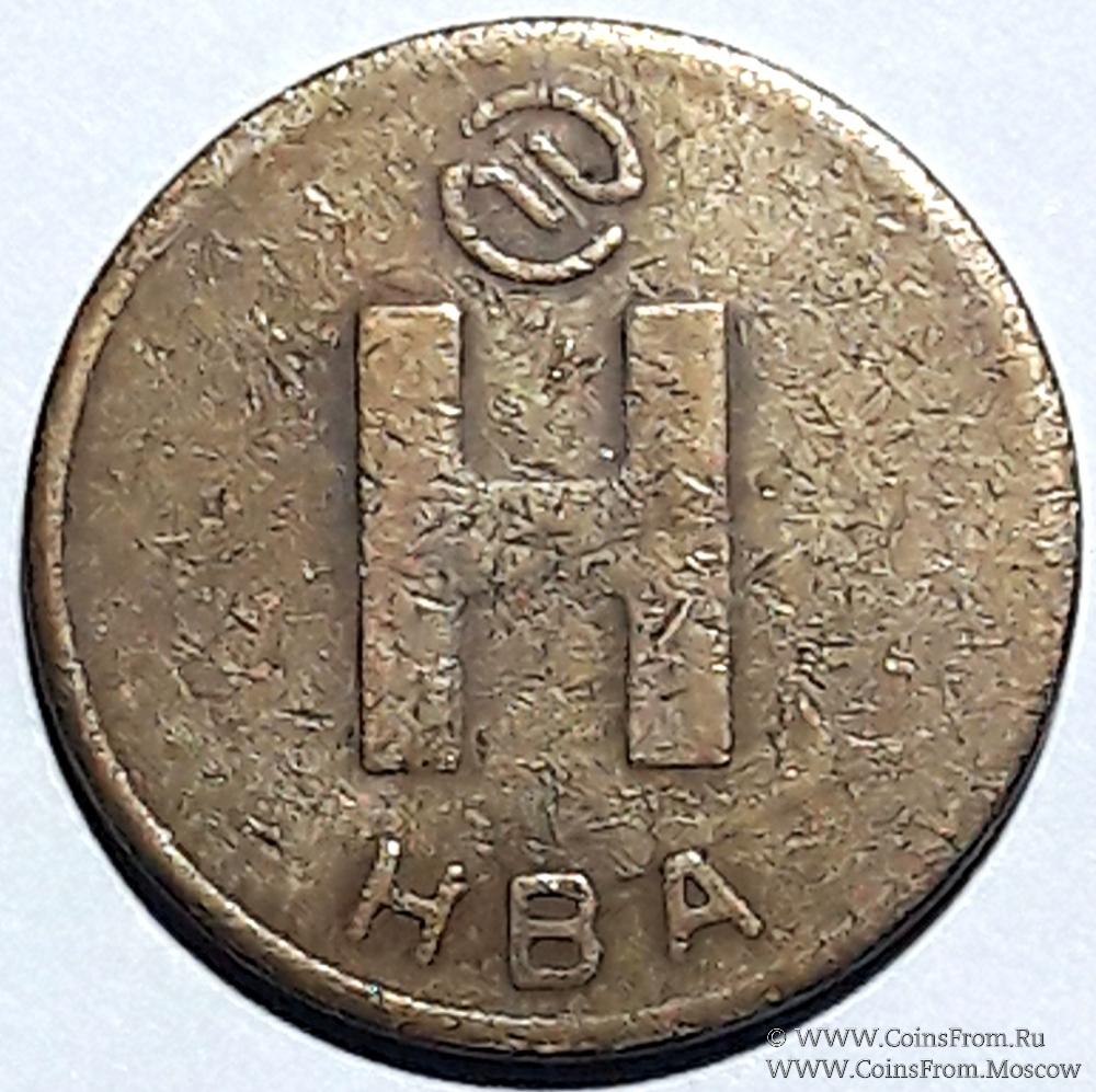 Металлический жетон медного цвета (сталь с медной плакировкой). Диаметр 24 мм. Изготовитель: "Новосибирский завод низковольтной аппаратуры" (НЗ НВА).