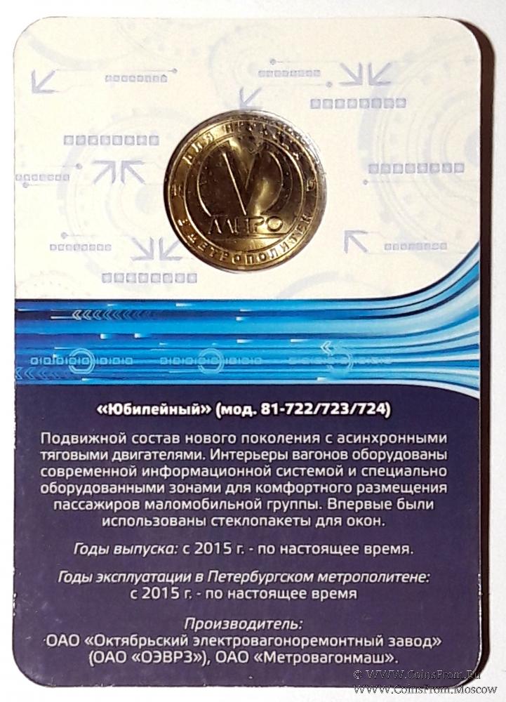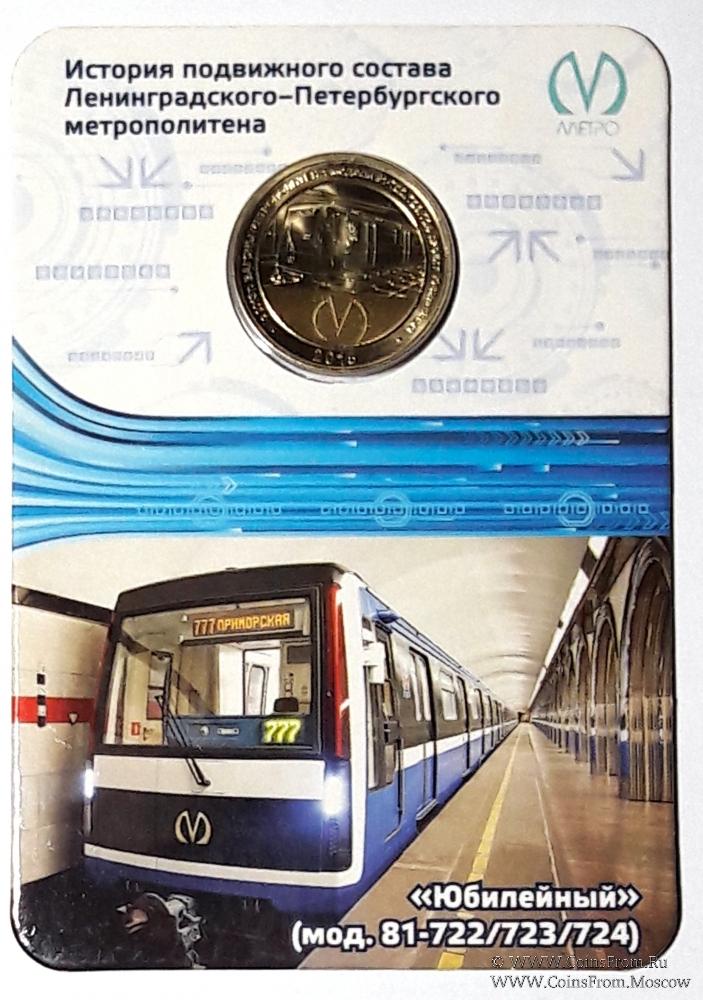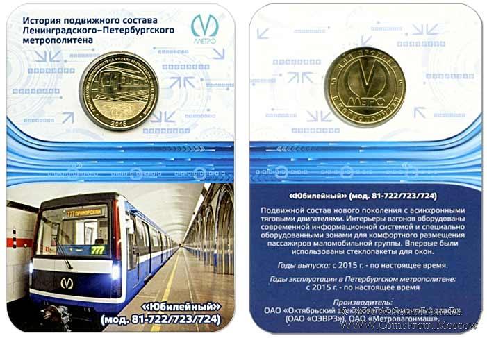 Юбилейный жетон серии "История подвижного состава Ленинградского-Петербургского метрополитена", на котором изображен вагон проекта "Юбилейный" (модель 81-722/723/724).