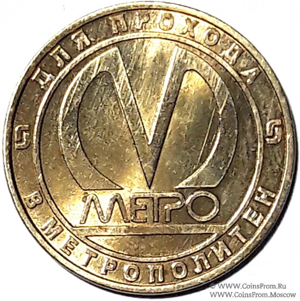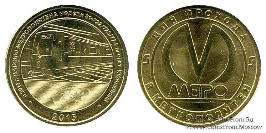 Юбилейный жетон серии "История подвижного состава Ленинградского-Петербургского метрополитена", на котором изображен вагон проекта "Юбилейный" (модель 81-722/723/724). Металл желтого цвета. Диаметр 23 мм. Без упаковки.