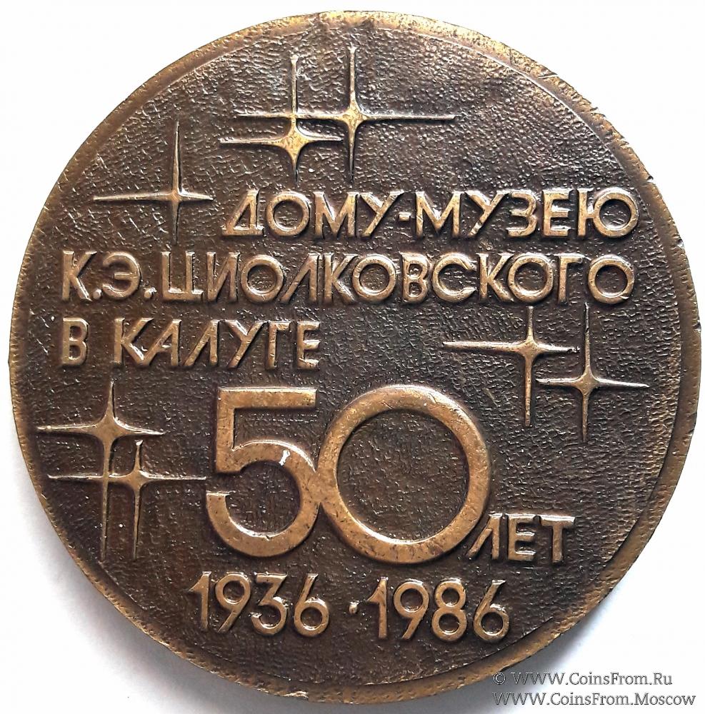 Памятная настольная медаль "50 лет дому-музею К.Э. Циолковского в Калуге" 1936-1986 Томпак. Диаметр 55 мм. Толщина 5,5 мм.