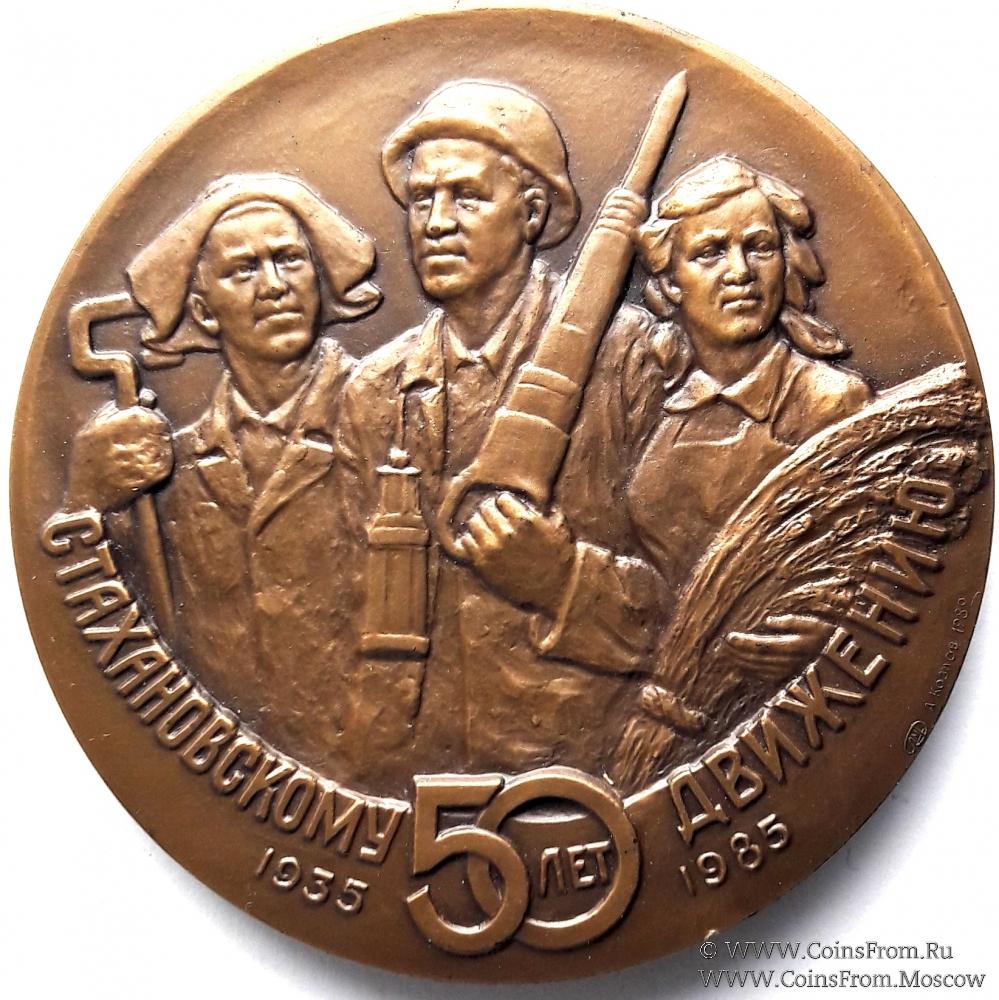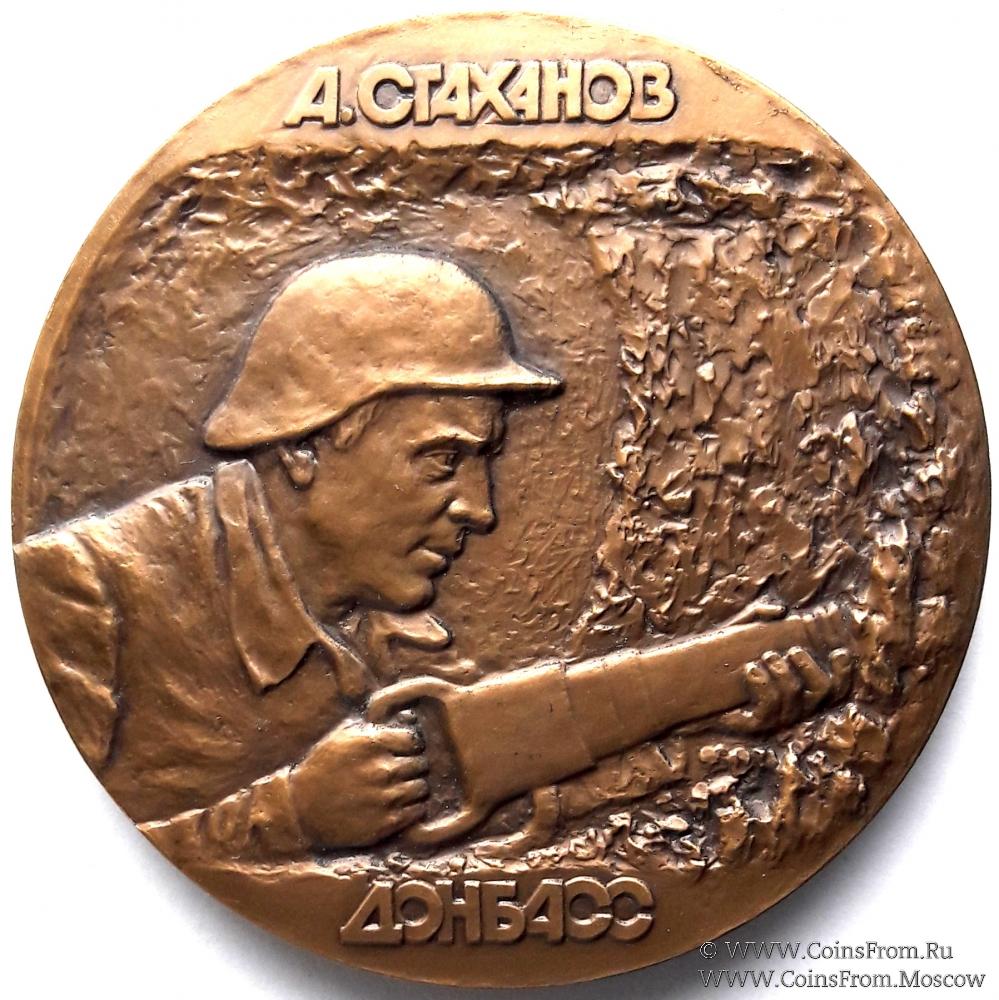 Памятная настольная медаль "50 лет стахановскому движению. А. Стаханов. Донбасс". 1985. ЛМД