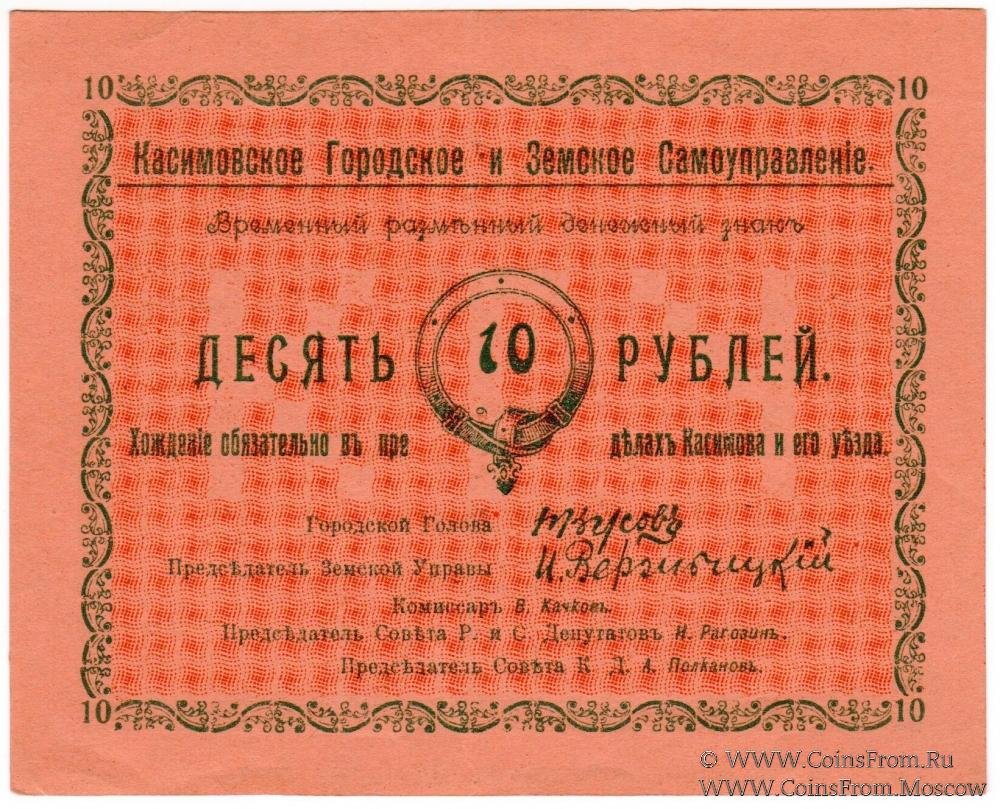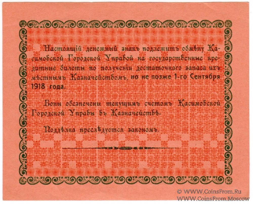 Временный разменный денежный знак без даты. 1918 г. Касимовское городское и Земское самоуправление.