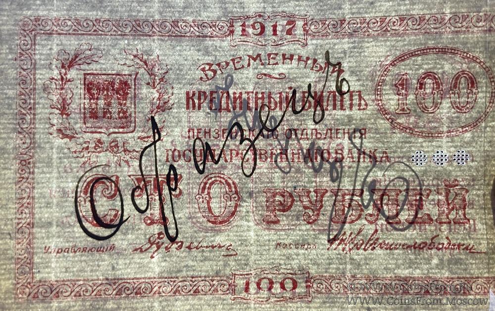 Временный кредитный билет 100 рублей 1917 г. ОБРАЗЕЦ двусторонний: диагональная надпись чёрного цвета "Образецъ" на аверсе и реверсе. Перфорация (***). Бумага верже. Пензенское Отделение Государственного Банка.