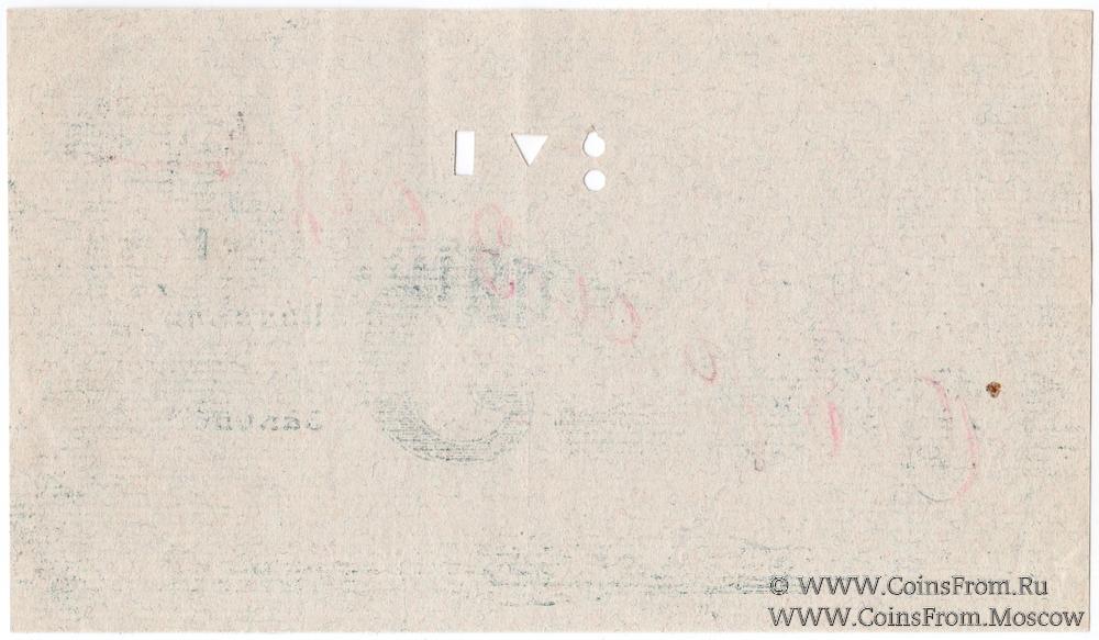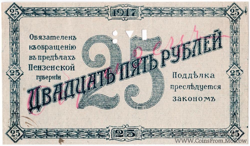 Временный кредитный билет 25 рублей 1917 г. ОБРАЗЕЦ (только реверс): диагональная надпись красного цвета "Образецъ". Пробивка. Бумага верже. Пензенское Отделение Государственного Банка.
