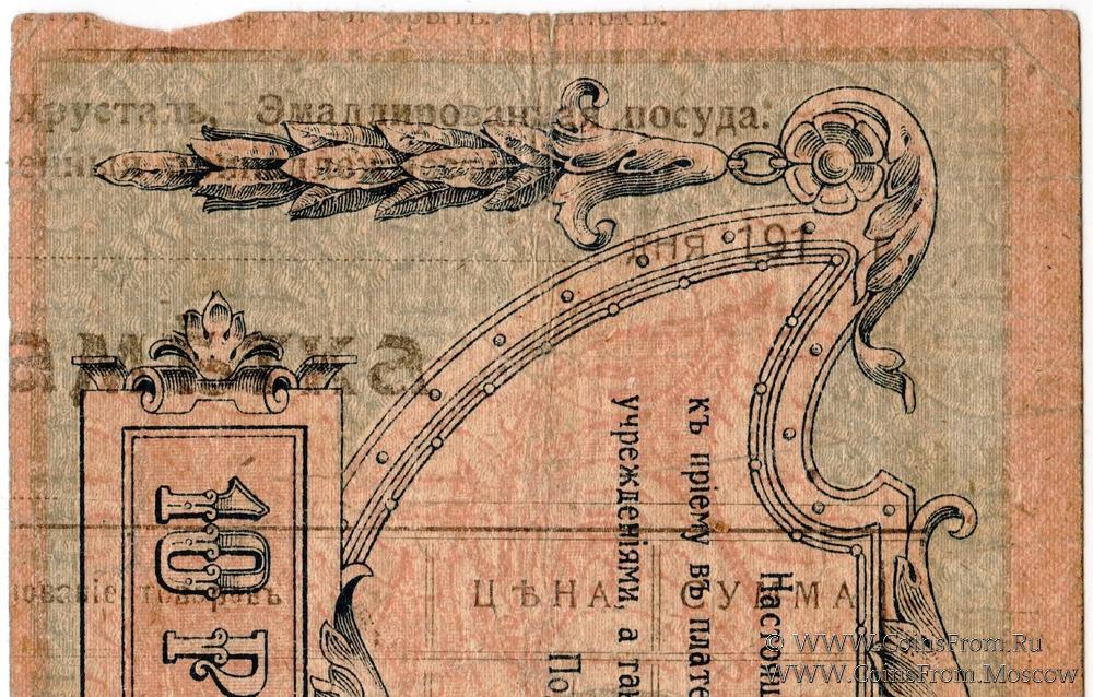 НАДПЕЧАТКА рекламная (хрусталь, эмалированная посуда…). Выпуск 1918 г. (Серии АБ-55…АД-64). Водяной знак - "линии". Перемычка.