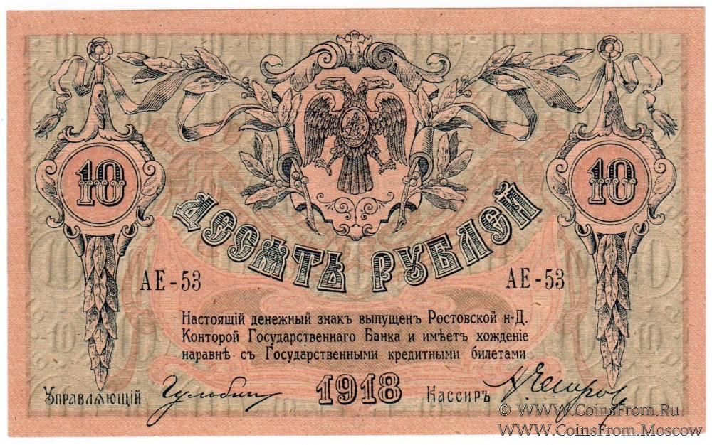 Денежный знак 1918 г. Выпуск 1918 г. (Серии АД-65…АЗ-50). Без водяного знака. Перемычка. Печать ЭИДЗ, Ростов на Дону.