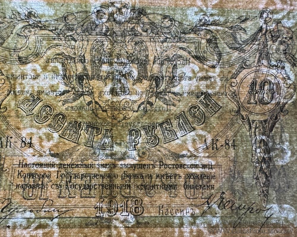 Денежный знак 1918 г. БРАК: смещение фона на аверсе. Серия АК. Водяной знак - "вензель ГБ". Перемычка. Печать ЭИДЗ, Ростов на Дону.