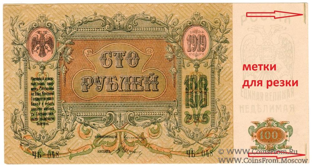 Денежный знак 1919 г. БРАК обрезки: с метками для резки на белом поле (на аверсе и реверсе). Выпуск 1919 г. (с серии ЧБ-001). Номер серии 3-значный. Без точки после цифр серии. Без водяного знака. Печать 4-я ЭЗГБ ВСЮР, Симферополь.