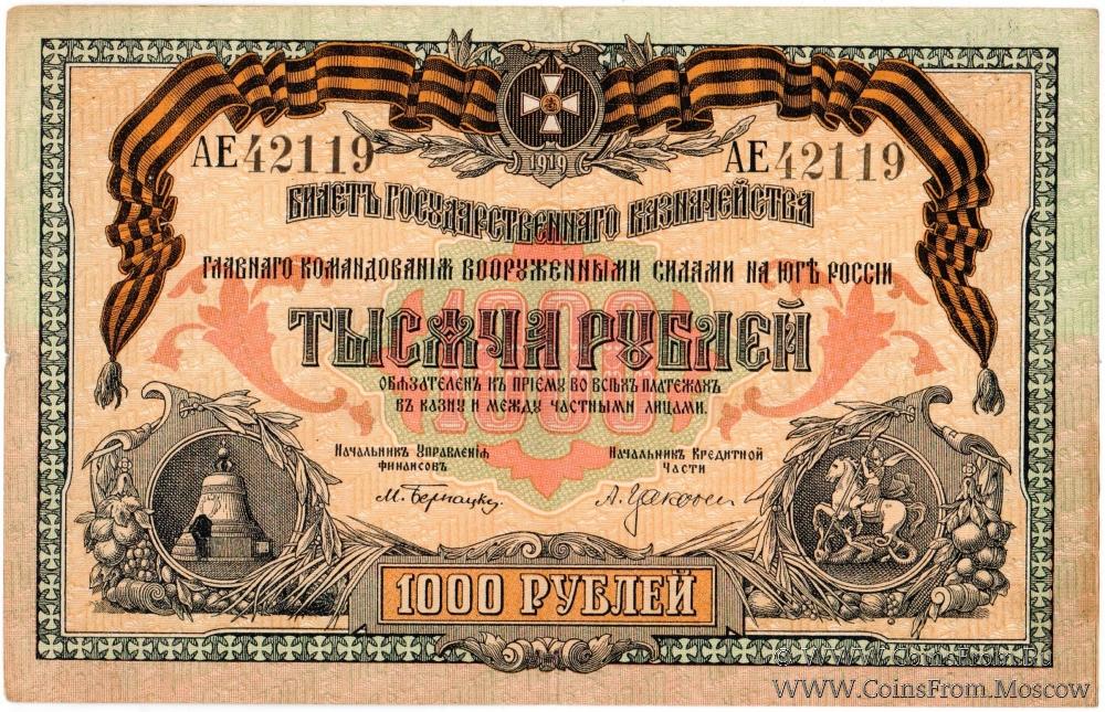Билет Государственного Казначейства ГК ВСЮР 1919 г.