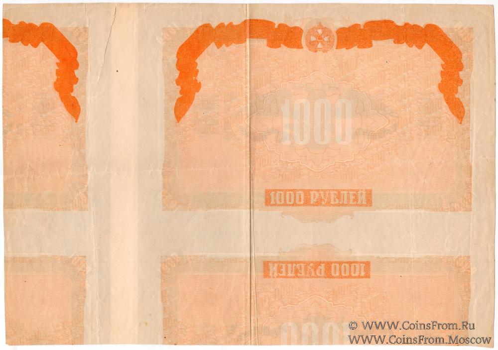 БРАК: недопечатка аверса, без номера, неразрезанная сцепка (из 4-х не целых банкнот). Без водяного знака. Билет Государственного Казначейства 1919 г.