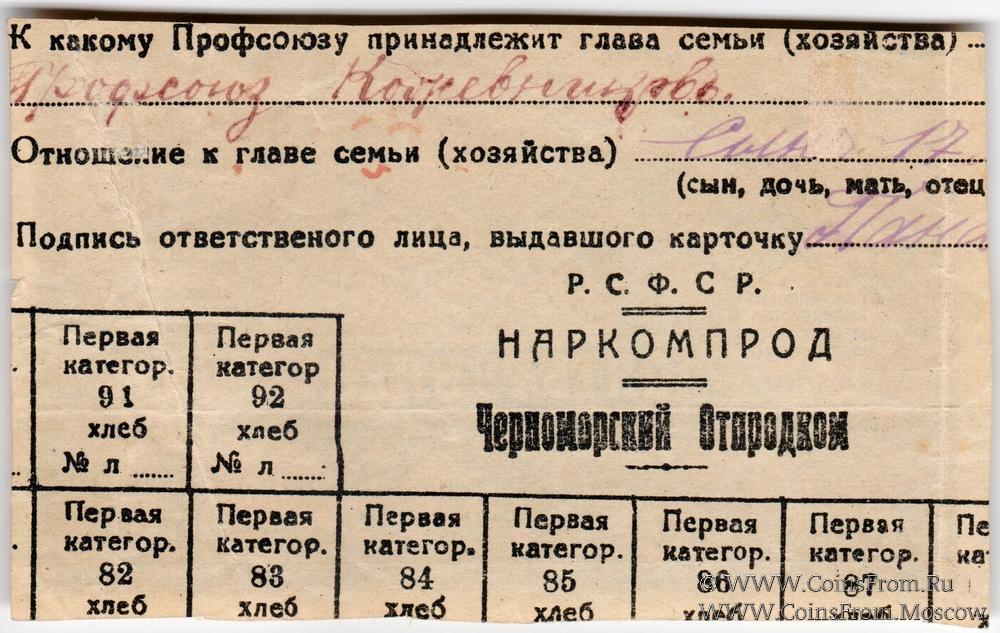 БРАК: только аверс. Вторичное использование: на реверсе фрагменты хлебной карточки НАРКОМПРОДа РСФСР (Черноморский Отпродком). Водяной знак - связанные звезды.