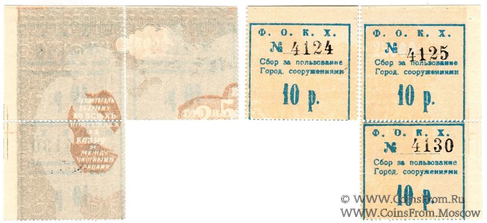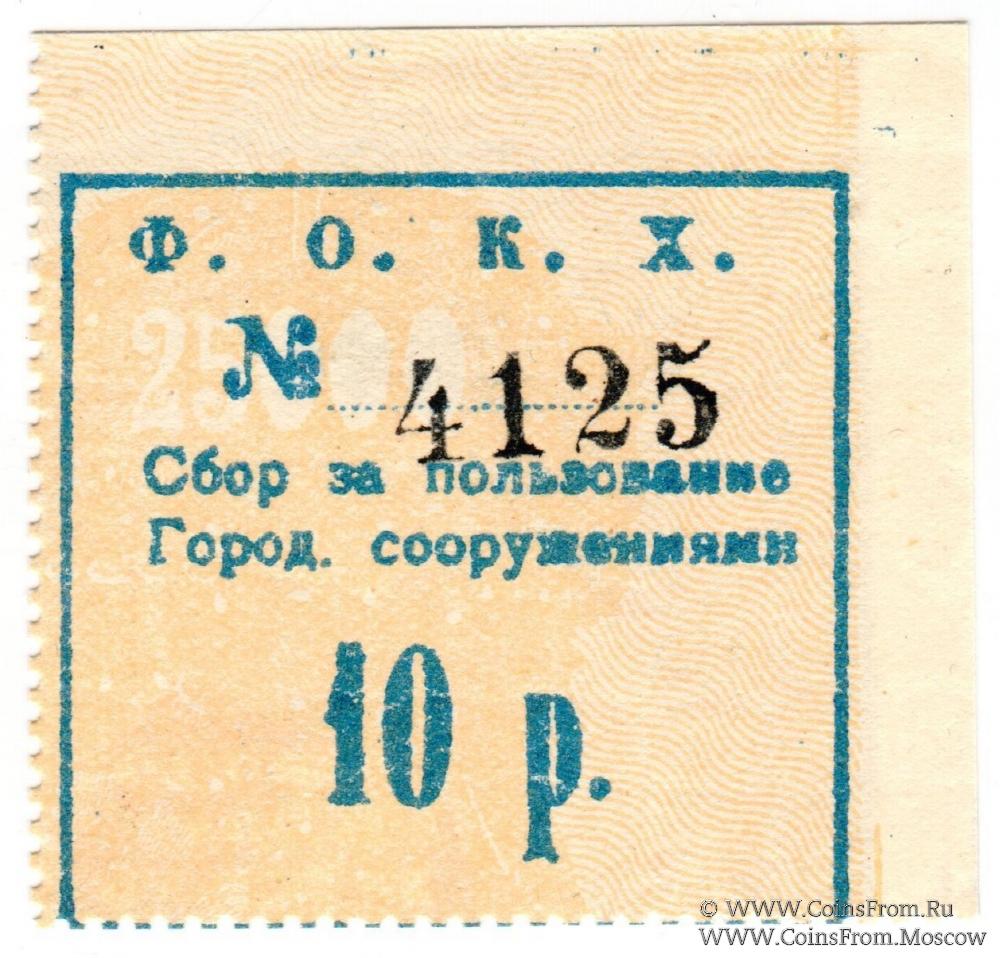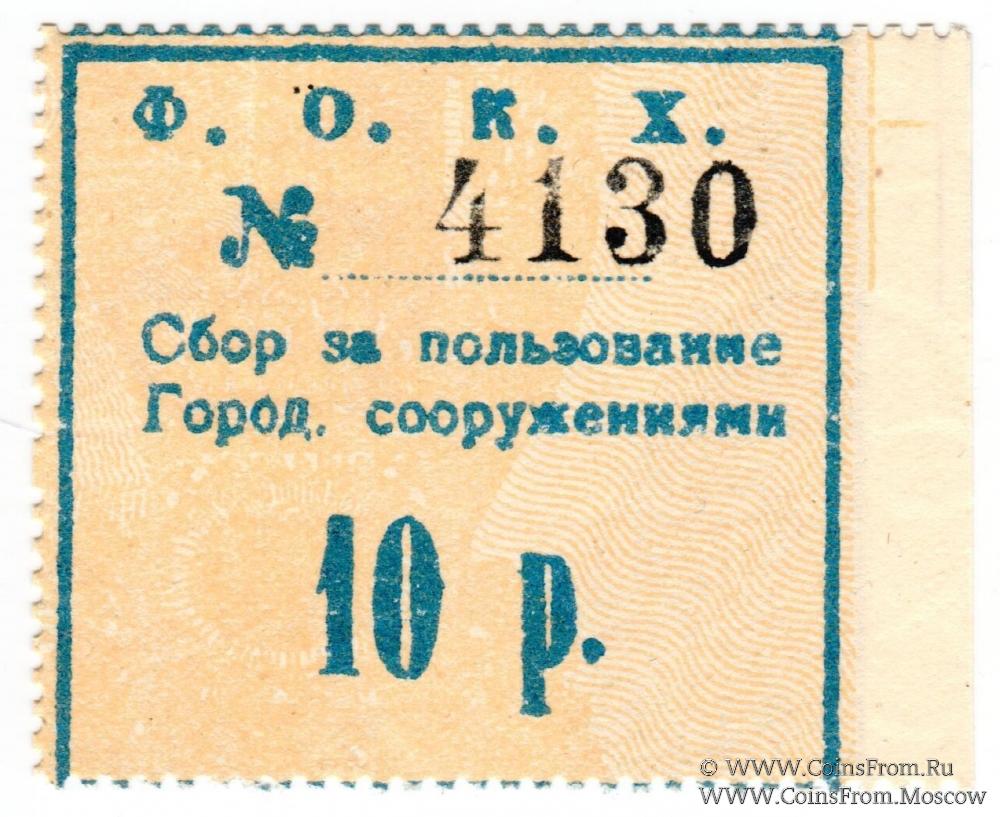 Вторичное использование: Феодосийское Общество Коммунального Хозяйства (Ф.О.К.Х.). 10 рублей. Сбор за пользование городскими сооружениями (г. Феодосия). Водяной знак - мозайка.