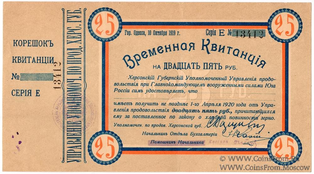Временная квитанция. Херсонский Губернский Уполномоченный Управления продовольствия при Главнокомандующем вооруженными силами на Юге России.