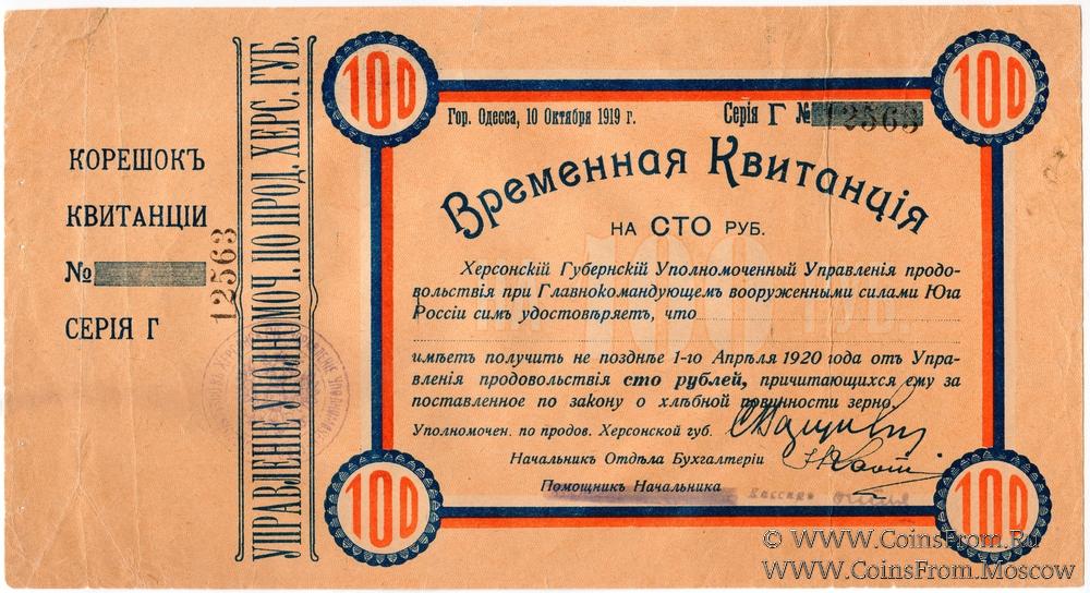 Временная квитанция. Херсонский Губернский Уполномоченный Управления продовольствия при Главнокомандующем вооруженными силами на Юге России.