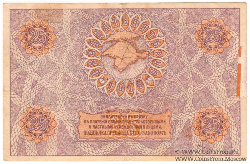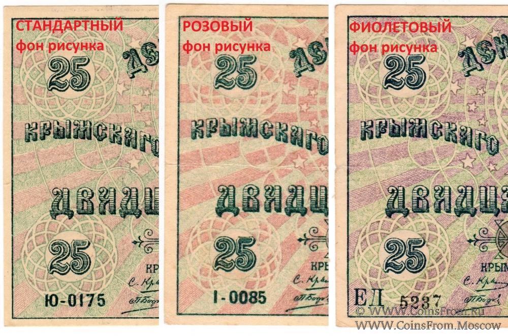 Денежный знак 1918 г. БРАК: фон аверса фиолетовый. В серии две литеры 4,5 мм. Номер 3,5 мм. Крымское Краевое Казначейство.
