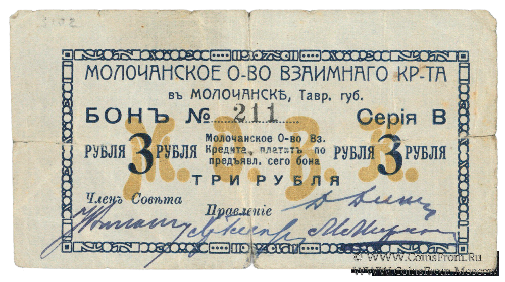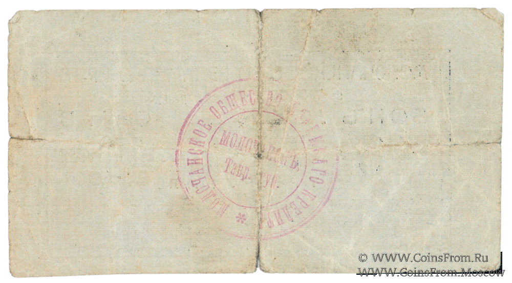 Бон без даты (1918 г.). Серия В. Бумага белая. Молочанское Общество Взаимного Кредита (М.О.В.К.).