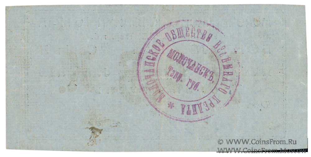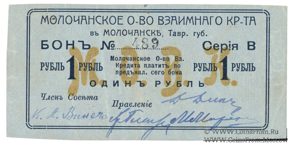 Бон без даты (1918 г.). Серия В. Бумага голубая. Элементы водяного знака. Молочанское Общество Взаимного Кредита (М.О.В.К.).
