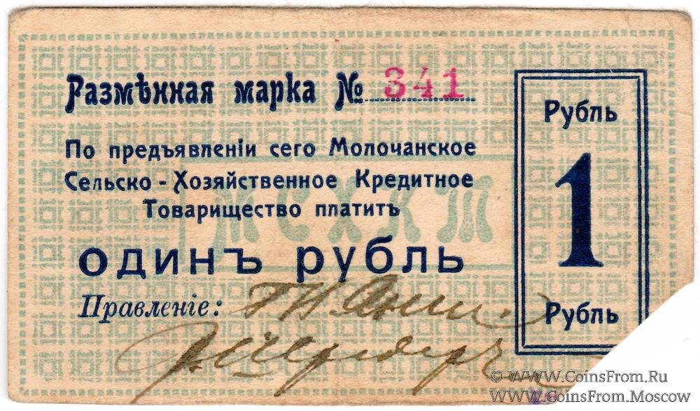 Разменная марка без даты (1918 г.). Номер 3-значный, красный. Гашение. Молочанское Сельско-Хозяйственное Кредитное Товарищество (МСХКТ).