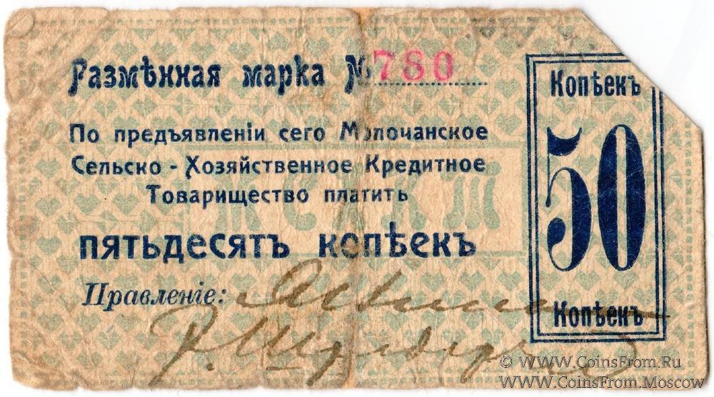 Разменная марка без даты (1918 г.). Номер 3-значный, красный. Молочанское Сельско-Хозяйственное Кредитное Товарищество (МСХКТ).