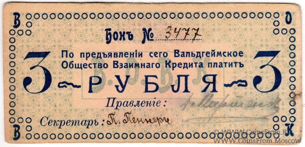 Бон без даты (1918 г.). Выпуск 2. С черной подписью. Цифры номинала широкие. Вальдгеймское Общество Взаимного Кредита (В.О.В.К.).