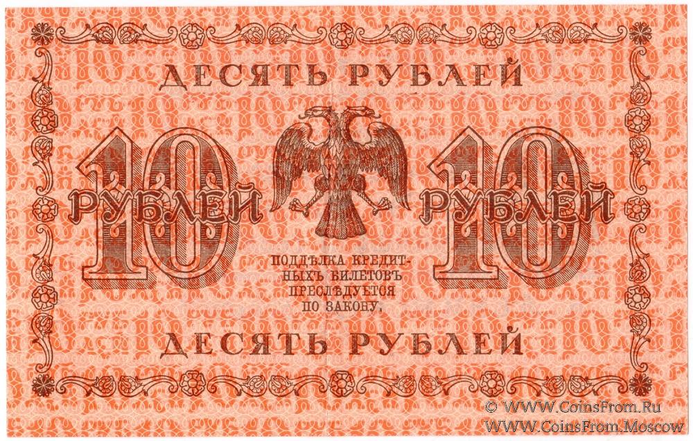 Надпечатка в рамке в четыре строки на государственном кредитном билете 10 рублей образца 1918 г. Шрифт надпечатки неровный (возможно штамп вырезан вручную).