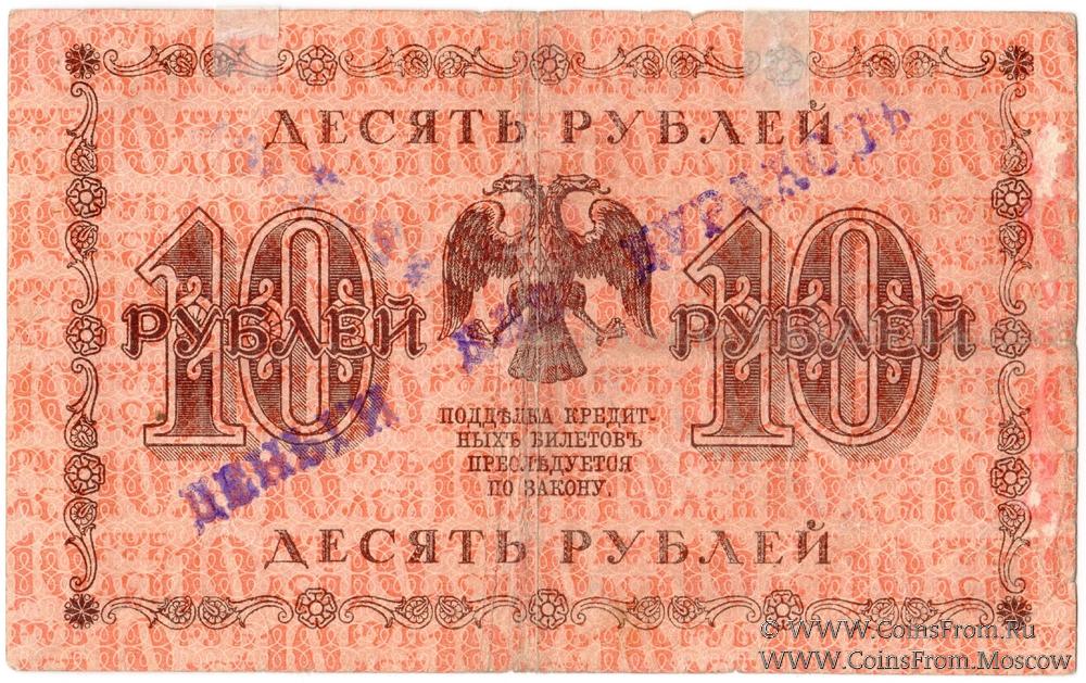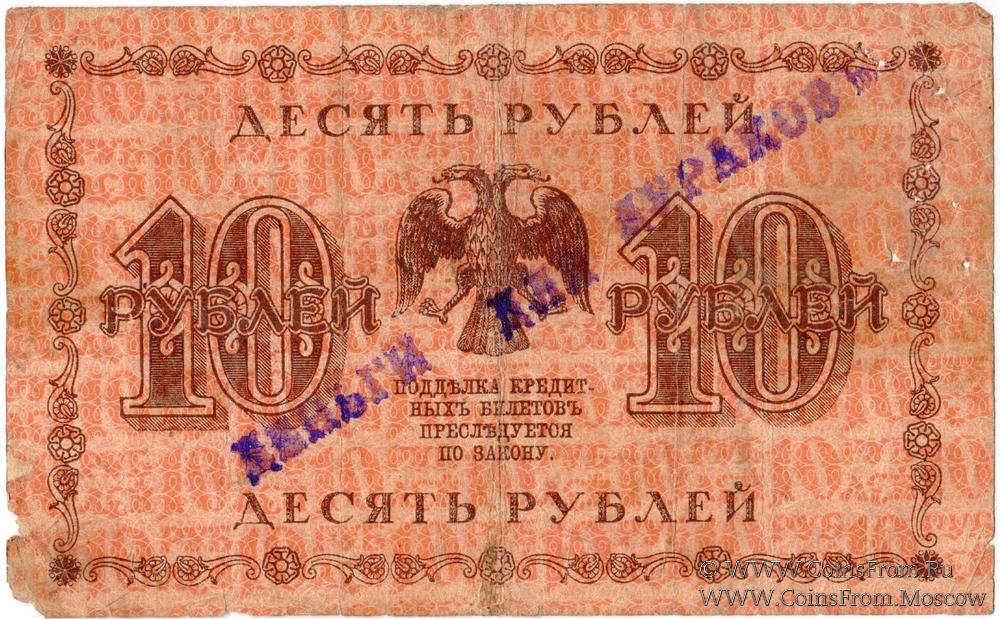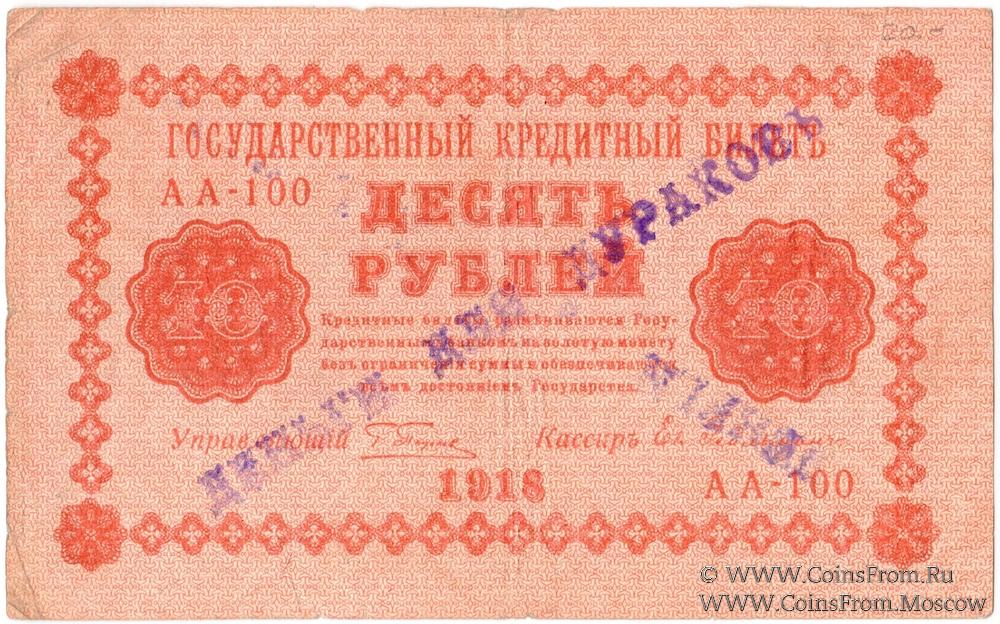 Надпечатка в одну строку на государственном кредитном билете 10 рублей образца 1918 г. Шрифт фигурный.