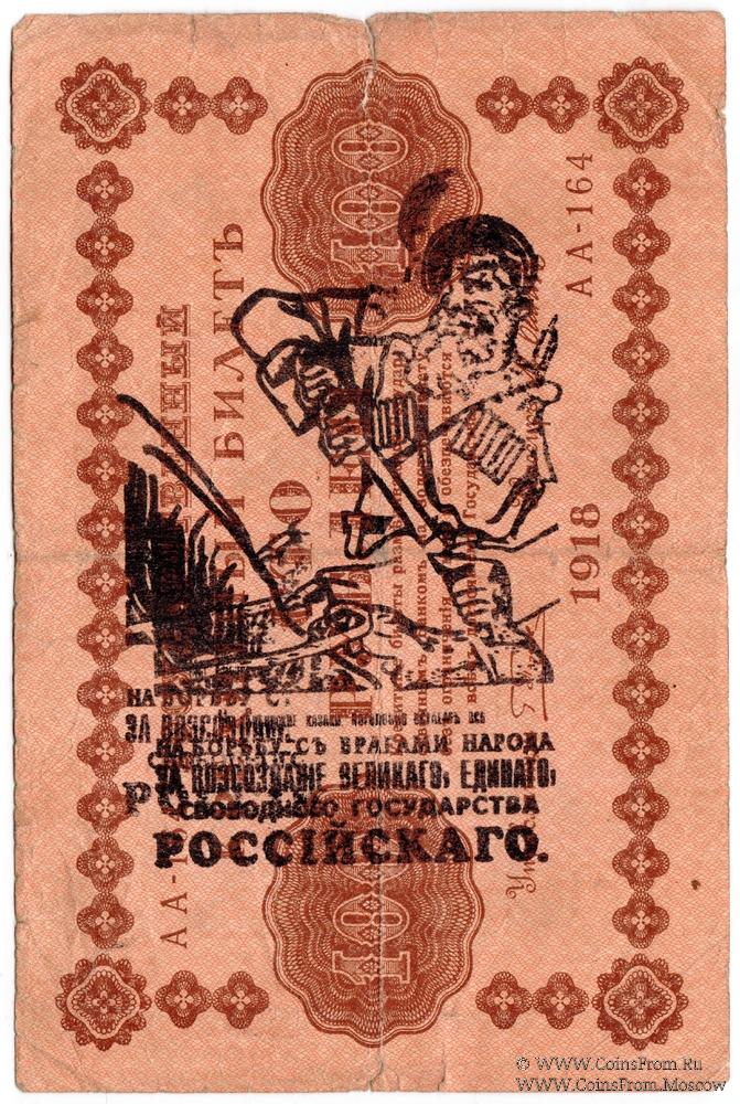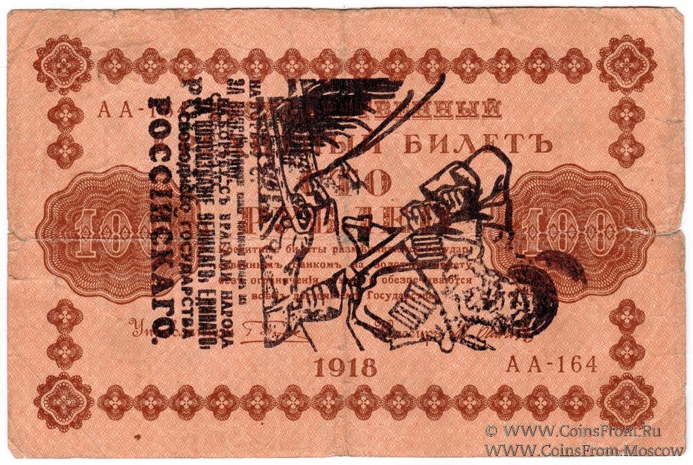 Надпечатка в четыре строки с рисунком и мелким текстом (неразборчиво) на государственном кредитном билете 100 рублей образца 1918 г. С ошибкой в тексте - "воЗсоздание".