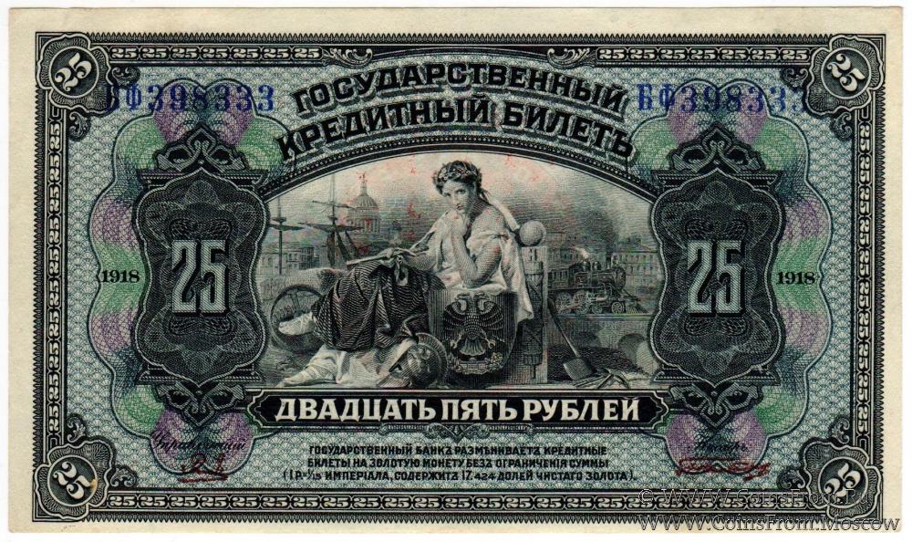 Кредитный билет 1918 г. Подписи на аверсе коричневые, на реверсе черные.