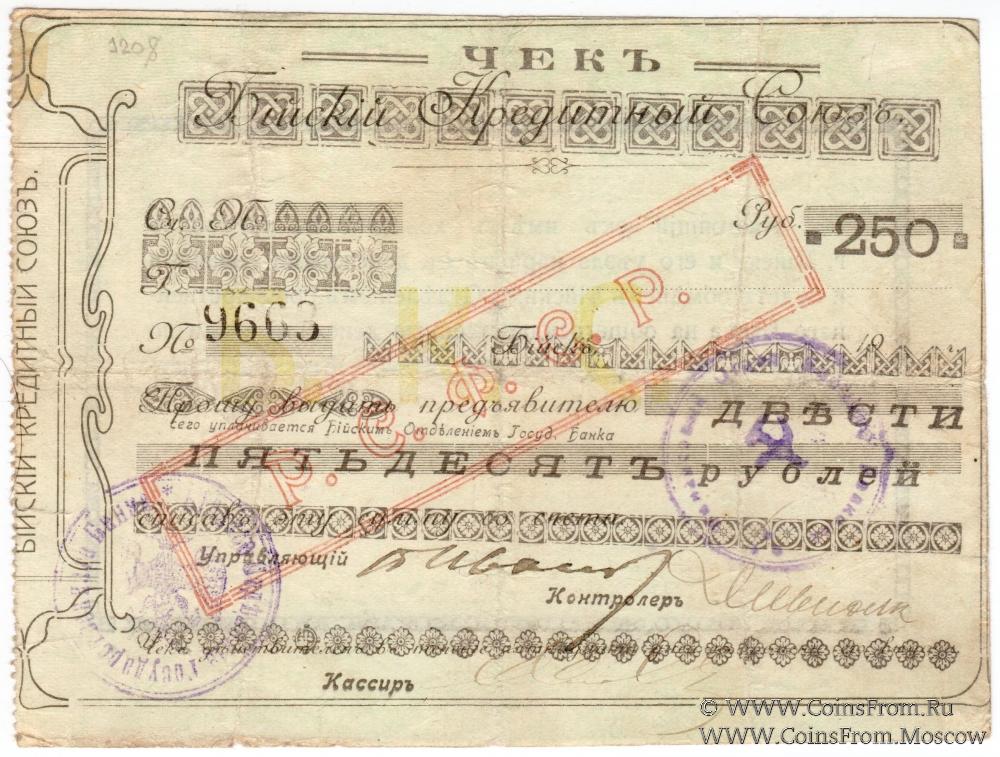 Чек. Без наименования банка. Первая буква "Р" в надпечатке "РСФСР" открытая. Бийское Отделение Государственного Банка.